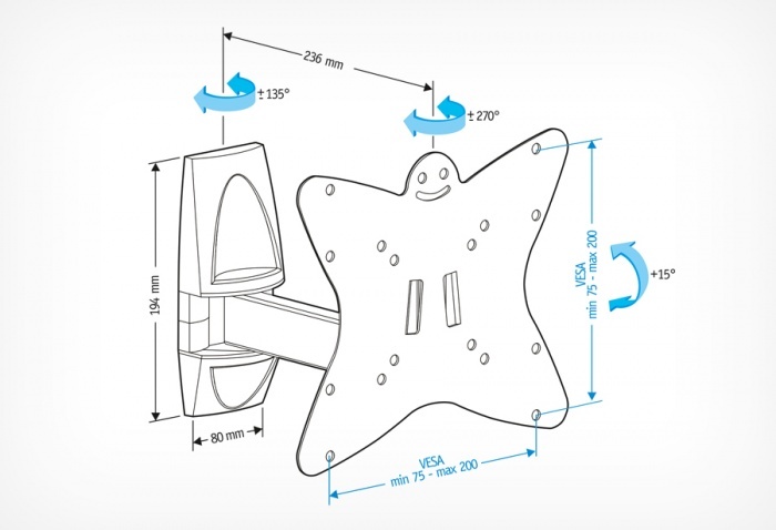 Назначение: для телевизоров. Тип установки: настенный. Регулировка: наклонно-поворотный. Диагональ экрана (дюймы): 15"-48" Диагональ экрана: 38-122 см. Расстояние от стены.