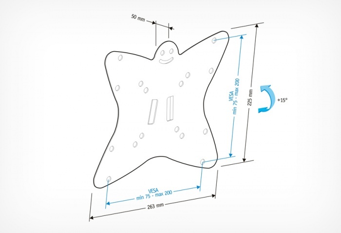 Диагональ: 20″ – 40″ Нагрузка: 45 кг. Крепежные отверстия: 75х75,100х100,200х100,200х200,200x300,300x300 мм. Угол наклона: – 3°+15° Расстояние от стены: 63 мм. Цвет: черный