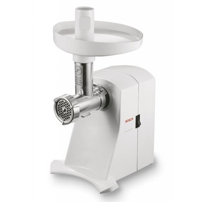 Электромясорубка Bosch MFW 1501 производительностью 1,5 кг/мин может не только перерабатывать мясо, но и выполнять функции кофемолки либо соковыжималки для ягод. В качестве дополнительных опций для данной модели предлагаются мельница для кофейных зерен, пресс для ягод, а также специальная насадка для печенья и решетки с диаметром отверстий 3 и 6 мм. В стандартную комплектацию помимо решетки с диаметром отверстий 4,5 мм входит еще одна предохранительная втулка. При работе это устройство с максимальной мощностью 1000 Вт надежно фиксируется на поверхности с помощью резиновых ножек. Для удобства хранения электромясорубка Bosch MFW 1501 компактно складывается, формовочным насадкам отведен специальный отсек.
