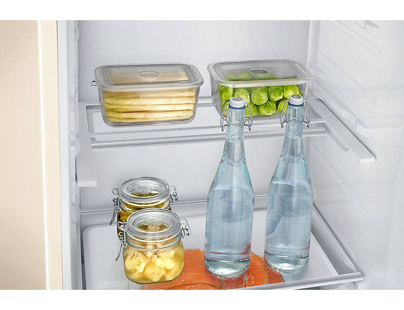 Благодаря выдвижной полке появляется возможность более рационально использовать внутренне пространство в камере - полка выдвигается и сдвигается, создавая больше места для высоких бутылок или больших упаковок.