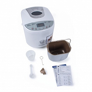 антипригарная ёмкость для выпечки, мерный стакан, мерная ложка, лопасть для замешивания теста, крюк для извлечения лопасти, руководство по эксплуатации, гарантийный талон