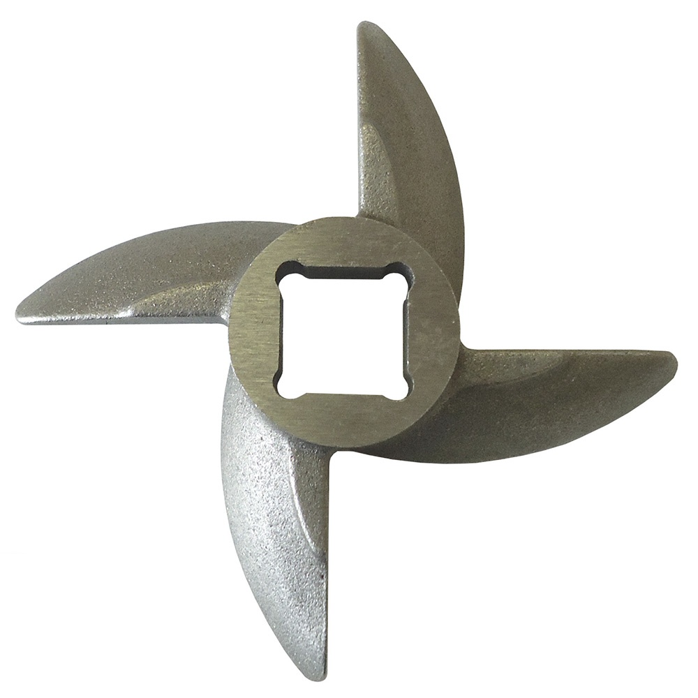 Износостойкий нож, изготовленный из высококачественной хромистой стали, имеет саблевидные режущие кромки, которые обеспечивают плавность работы мясорубки и повышают качество переработки продукта.