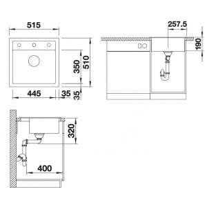 Ширина: 46.5 см. Глубина: 51 см. Ширина шкафа: 45 см. Угловой радиус: 15 мм. Глубина чаши: 19 см. Дизайн. Материал: гранит. Форма: квадратная Крыло: нет