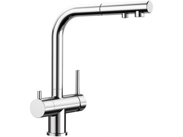 Как и у всех смесителей BLANCO для подключения фильтра в новинке предусмотрены два отдельных рычага для управления подачей питьевой и водопроводной воды, для холодной и горячей — справа и для фильтрованной — слева. В новом смесителе, как и в прежних версиях, питьевая и водопроводная вода подаются по разным шлангам и выводятся через разные изливы, обеспечивая гигиеничность.
