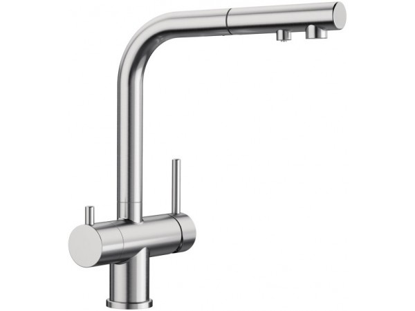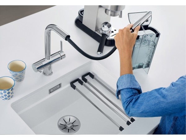 Как и у всех смесителей BLANCO для подключения фильтра в новинке предусмотрены два отдельных рычага для управления подачей питьевой и водопроводной воды, для холодной и горячей — справа и для фильтрованной — слева. В новом смесителе, как и в прежних версиях, питьевая и водопроводная вода подаются по разным шлангам и выводятся через разные изливы, обеспечивая гигиеничность.