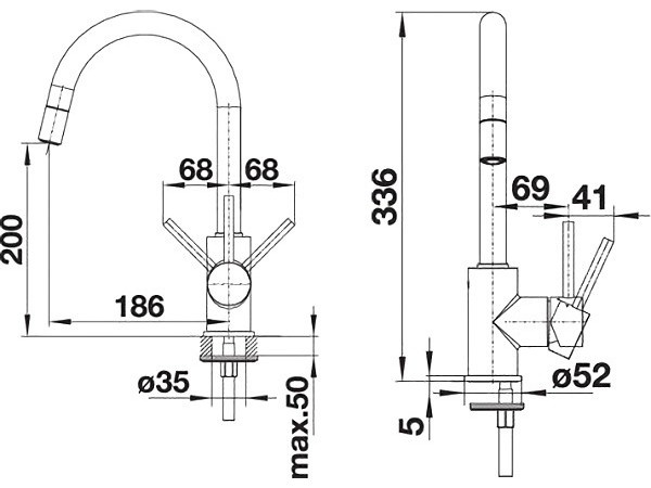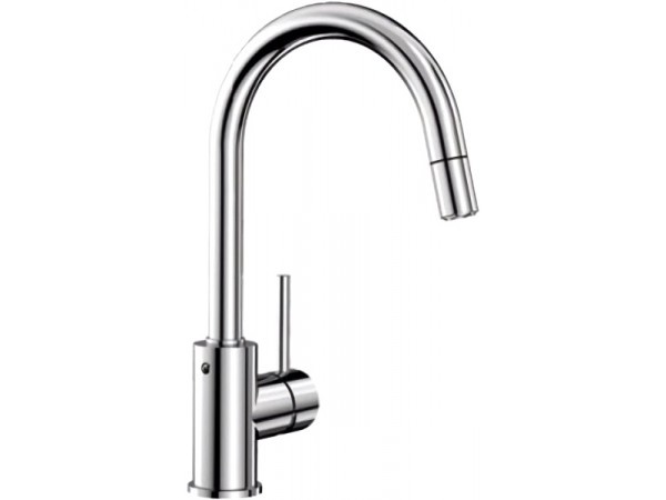 Длина излива 186 мм. Высота излива 200 мм. Поворот излива 360° Латунь покрытие Silgranit. Выдвижной излив один режим излива струя Рассекатель запатентованный рассекатель.