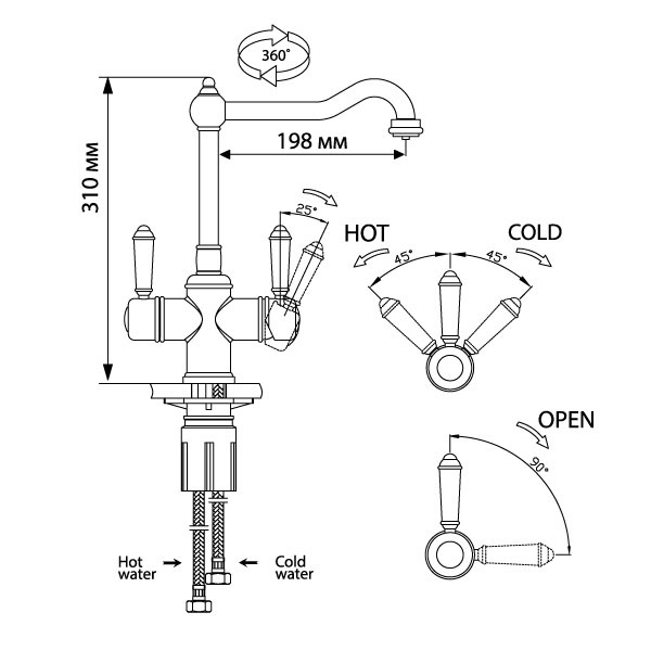 Наряду с этим имеются стильные поворотные рычаги для легкого выбора оптимальной температуры и напора воды. Устройство не подвержено образованию коррозии и не боится физических повреждений. За счет шикарного оттенка Античная латунь, смеситель станет ярким акцентом в Вашем интерьере.