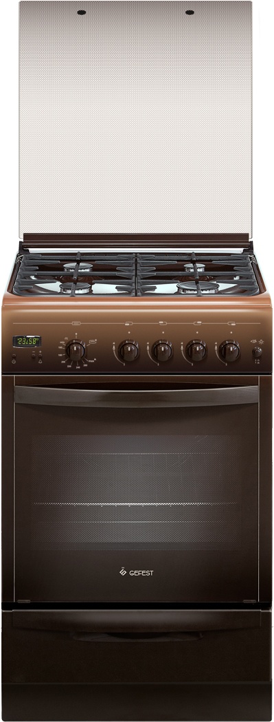 Коричневый эмалированный фасад, стеклянная крышка. Особенности. Чугунные решетки. Таймер электронный. Газ-контроль горелок стола. Газ-контроль духовки. Встроенный в ручки.