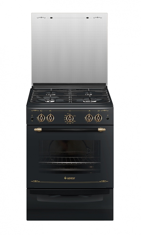 Крышка: стеклянная Габаритные размеры (ШхГхВ): 60x60x85 см. Объем духовки: 52 л. Чугунные решетки. Электророзжиг. Газ-контроль духовки. Съемные проволочные направляющие.