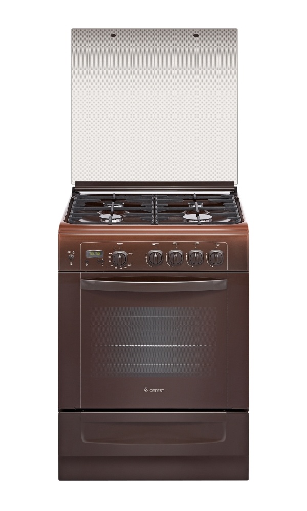 Коричневый эмалированный фасад, стеклянная крышка стола. Особенности. Чугунные решетки. Таймер механический. Газ-контроль духовки. Электророзжиг горелок стола, кнопка.