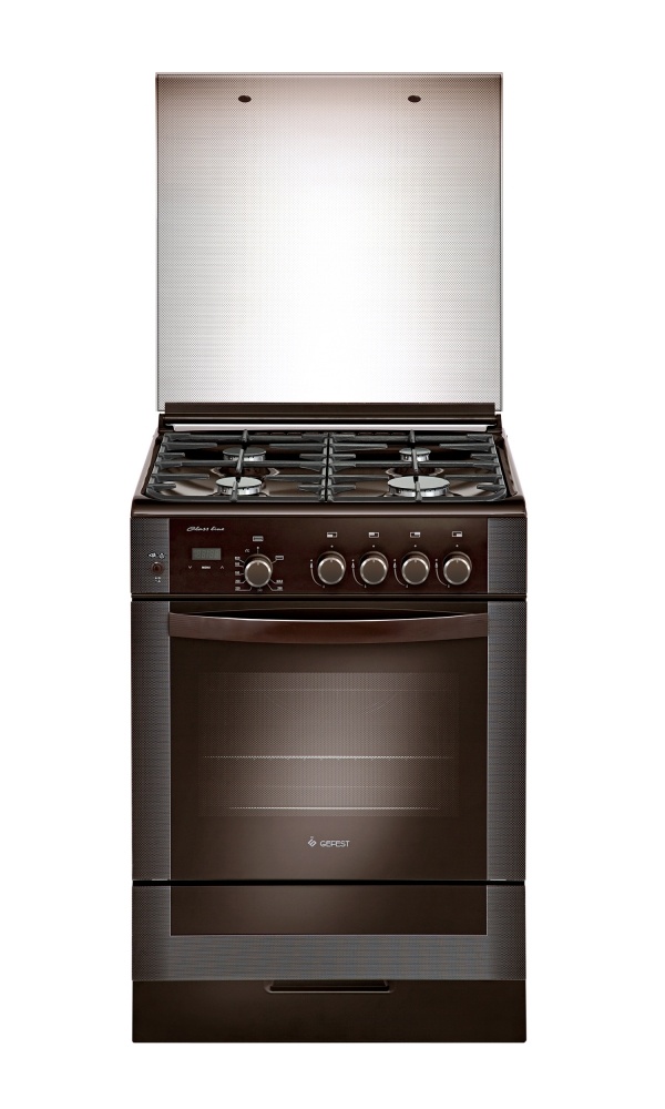 Фасад стеклянный коричневый с растровым рисунком. Особенности. Чугунные решетки стола. Таймер электронный. Встроенный в ручки управления электрозжиг горелок стола.