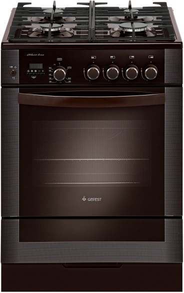 Фасад стеклянный коричневый с растровым рисунком. Особенности. Чугунные решетки стола. Таймер электронный. Встроенный в ручки управления электрозжиг горелок стола.