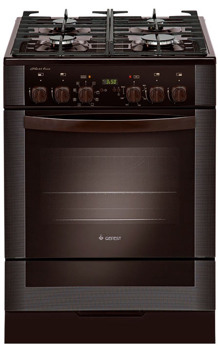 Коричневый эмалированный фасад, стеклянная крышка. Особенности. Чугунные решетки. Таймер электронный. Газ-контроль горелок стола. Газ-контроль духовки. Встроенный в ручки.