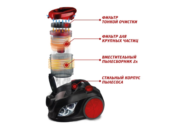 Мощный двигатель: 2200 Вт. Мощность всасывания: 400 Вт. Объем пылесборника: 2 л. Технология "Мультициклон" HEPA фильтр. Система мягкого пуска. Низкий уровень шума