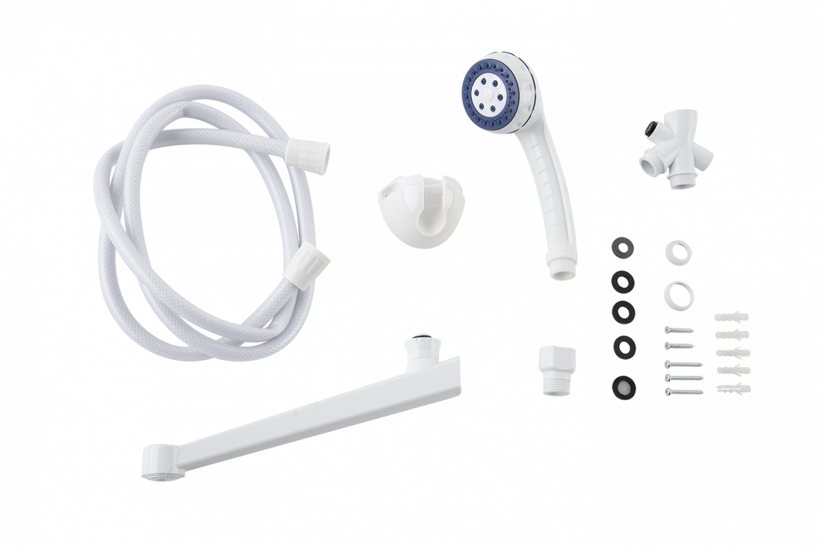 Расширенная комплектация: вместе с водонагревателем в комплекте идёт полный набор душевых аксессуаров: лейка, шланг, держатель и кран.