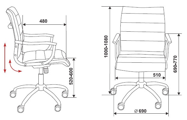 Хромированный металлический каркас, крестовина и подлокотники (с пластиковыми накладками)