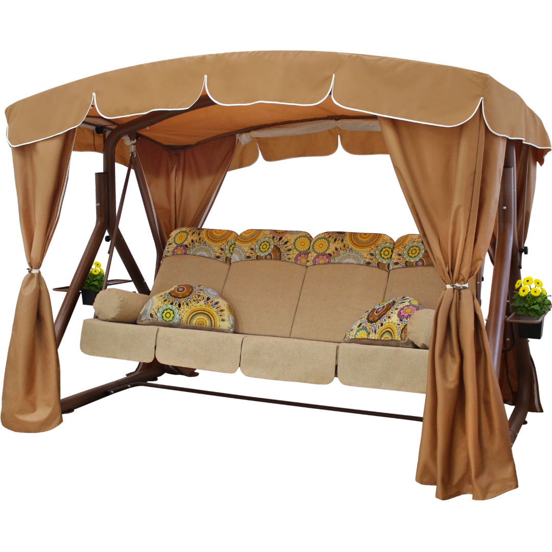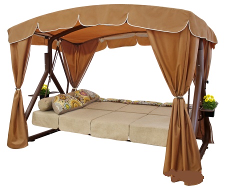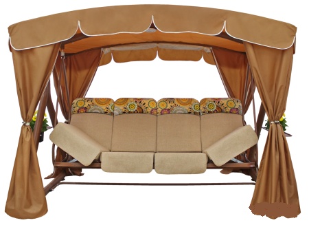 угол наклона спинки регулируется - качели можно разложить полностью на 180 градусов, превратив ее в комфортную двуспальную кровать + поднимающиеся подголовники