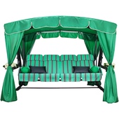 Размер в собранном виде 2470х1400х1880. Максимальная нагрузка 500 кг. В комплектацию качели входят: 4 подушки кресла с увеличенными подголовниками. Чехлы подушек изготовлены из высокопрочной ткани с водоотталкивающим покрытием, наполнение - листовой поролон 100 мм., 2 дополнительные подушки, 2 мягких подлокотника, 2 металлических подстаканника с подставкой под цветы, светодиодный фонарь. Раскладывается в полноценную кровать, длина сиденья 1990 мм., регулировка наклона спинки звеньями цепи, фиксируется защелками на металлической перекладине.