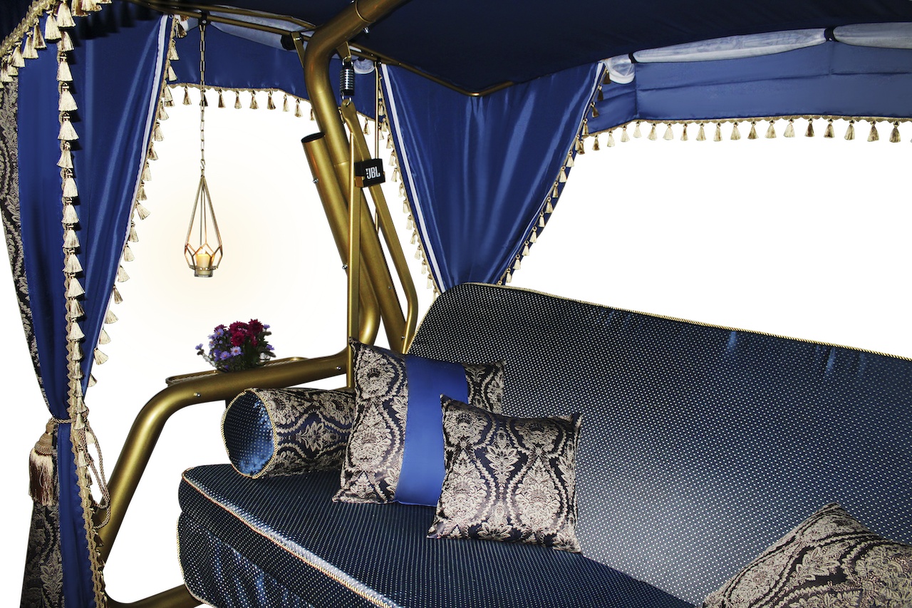 | Комплектация | каркас с гнутой крышей, большие подстаканники с подставкой под цветы (2 шт.), тентодержатели (2 шт.), металлические подголовники на спинке сидения (4 шт.), подставка под портативную акустику JBL + колонка JBL (1 шт.), подсвечники (2 шт.). Тент Люкс с открывающимися окнами, диван с оборкой, дополнительные подушки (всего 6 шт.) |