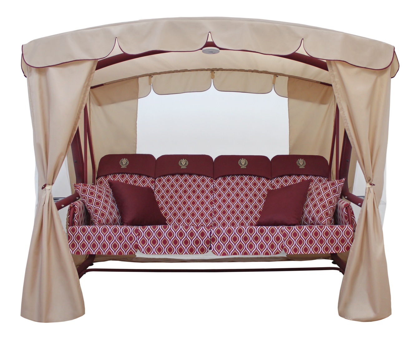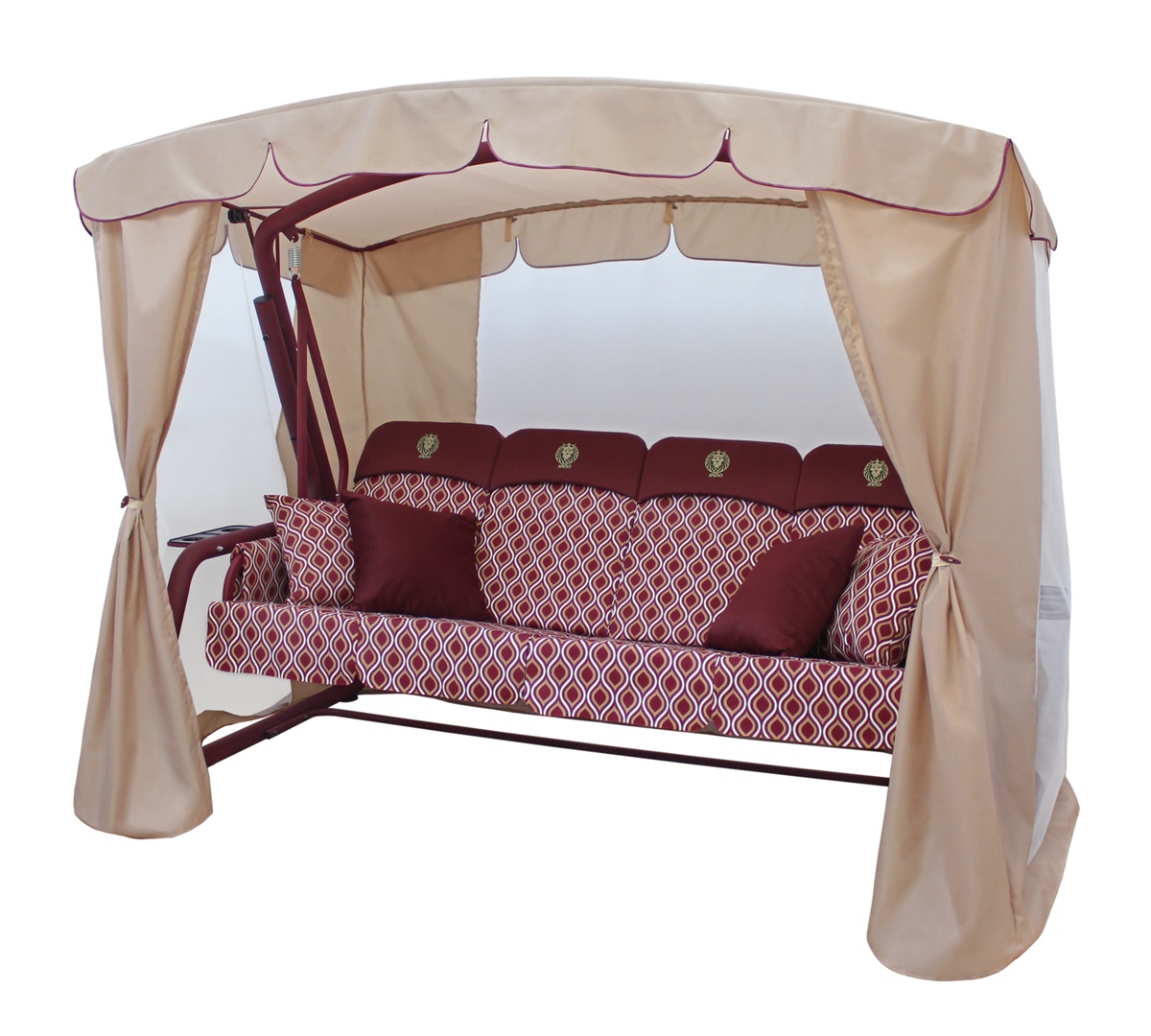 В комплект садовых качелей входят следующие аксессуары: 4 подушки-кресла с оборкой (наполнение - Холофайбер, 100 мм), 4 мягких подголовника с вышивкой, 2 подлокотника, 4 дополнительные подушки, тент-шатер с антимоскитной сеткой, светодиодный фонарь.