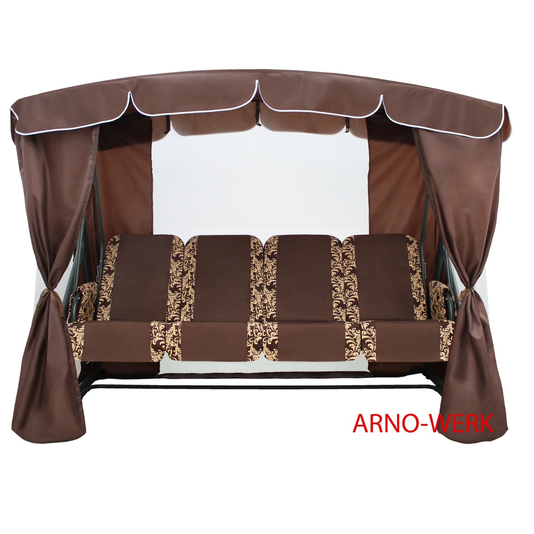 Вес в упаковке, кг: 65 Особенности Максимальная нагрузка, кг: 380 Диаметр трубы, мм: 51 Цвет и материал тента: тент Люкс. Основа - светло-коричневый Оксфорд 210 с белой окантовкой Комплектация: 4 подушки-кресла с оборкой (закругленный верх), тент-шатер с антимоскитной сеткой, дугообразная крыша, 2 металлических тентодержателя, 2 подлокотника Подвесы: Изготовлены из металлической трубы овального сечения, что позволяет увеличить нагрузку на качель. Количество мест: 4 Москитная сетка: да Регулировка спинки: да Навес: да Габариты, мм (ДхШхВ): 2320х1250х1950 Габариты в упаковке, мм: 2400х800х300 Наполнение матраса: холлофайбер, 80 мм