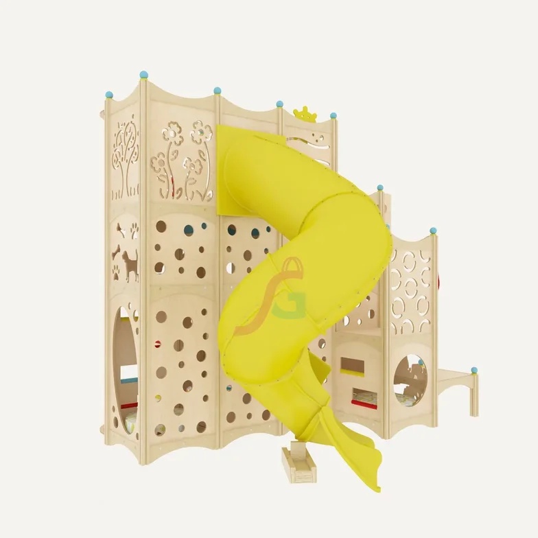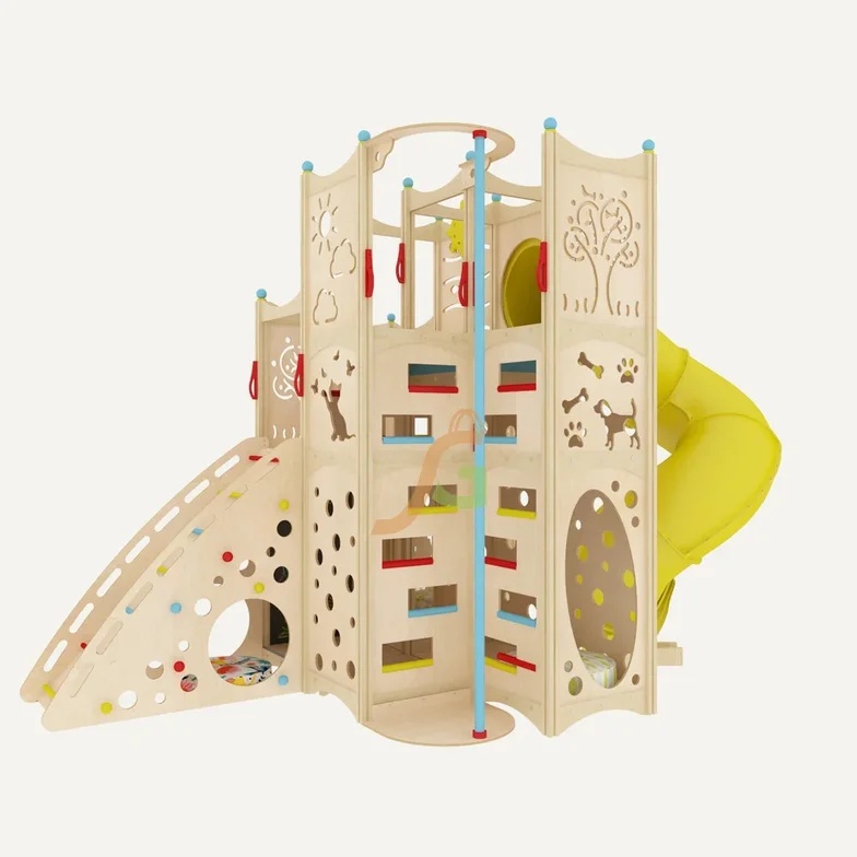 | Представленная конструкция оснащена не только спортивными модулями (горкой-трубой, скалодромом, шестом, лесенкой), но и столиком, который понадобится детишкам для рисования, чаепития; | |