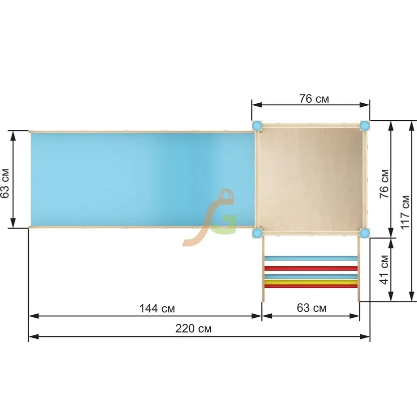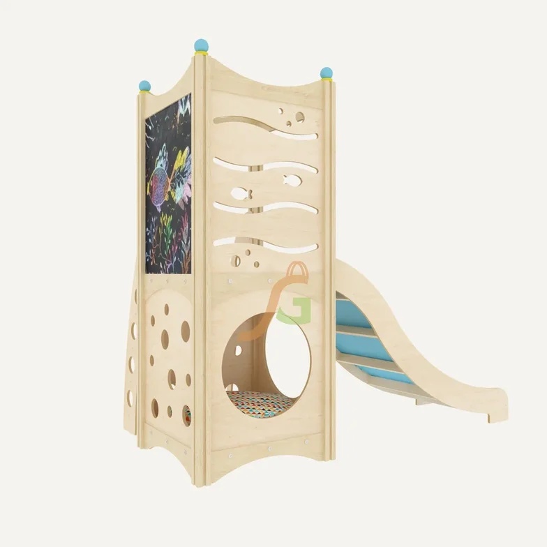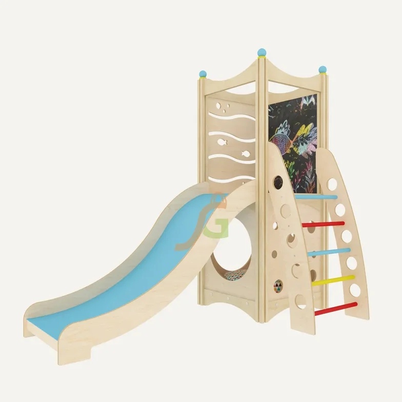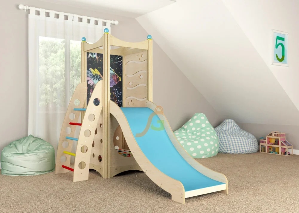 Игровая конструкция для всестороннего развития детей. Игровой комплекс спроектирован для детей дошкольного возраста. Он включает минимум составляющих элементов, которые пользуются огромной популярностью у ребят: волновая горка с невысокими бортиками; двухуровневый каркасный короб в виде домика; лесенка с прочными поручнями. Каждый элемент наделён красочным оформлением, чтобы дети в процессе игры могли изучать основные цвета. Внутри домика малыши могут комфортно расположиться вместе с игрушками. Конструкция направлена не только на развитие физических способностей детей, но и совершенствование творческих данных: предусмотрено наличие грифельной доски. Выделяются и другие преимущества игрового домика: Имея собственный игровой уголок, ребёнок может уединяться; Появляется возможность развиваться социально, ведь ребёнок может пригласить в свой домик друзей; В процессе игры формируются навыки ролевых игр; Совершенствуется координация.