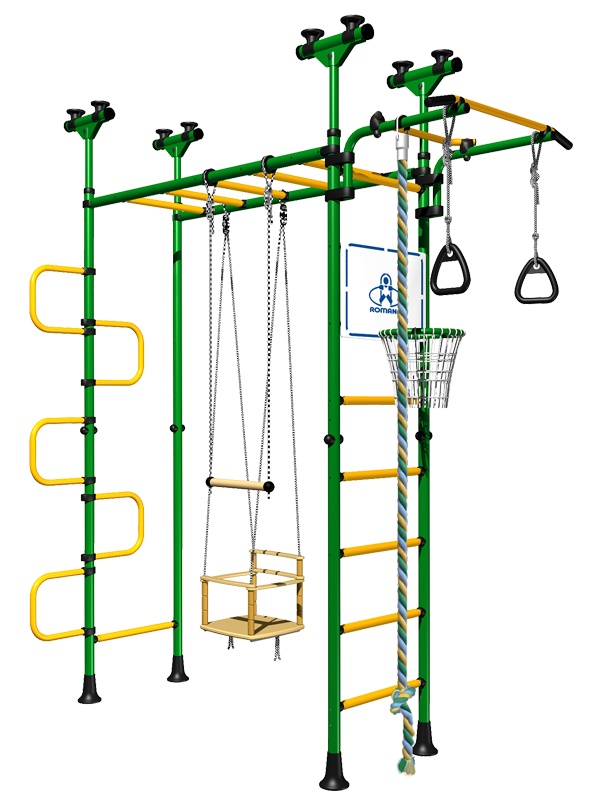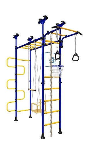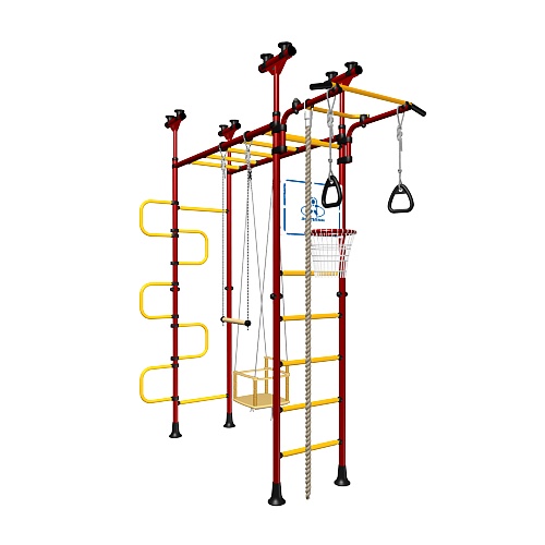 Комплекс представляет собой сборно-разборную металлическую П-образную конструкцию. Крепится враспор между полом и потолком. Металлическая шведская стенка с массажными пластиковыми перекладинами.