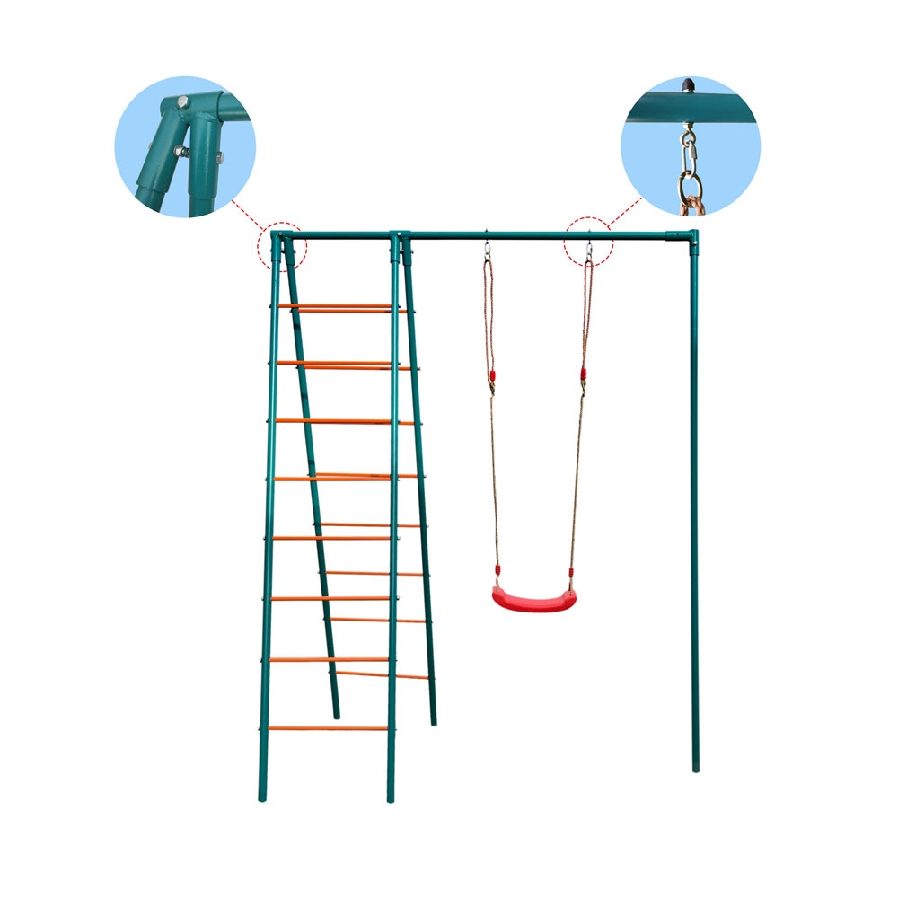 | Комплектация | металлоконструкция (стойки, перекладины), комплект крепежа (болты, гайки, шайбы), пластиковые качели "Лодочка" (дети 3-14 лет), (болты, рым-гайки, шайбы, карабины для крепления качелей) |