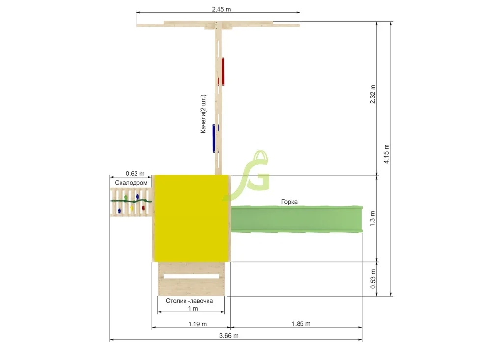Конструкция детского городка довольно компактна, при этом включает много развлечений для детей разного возраста.