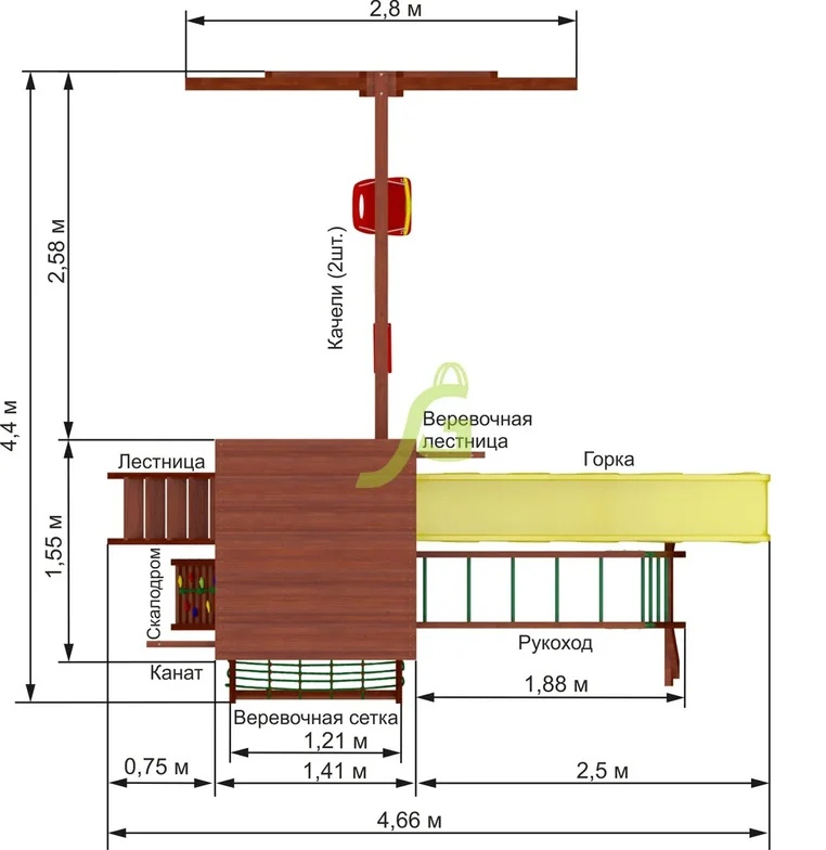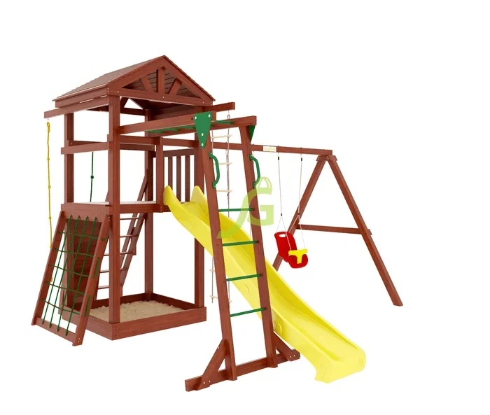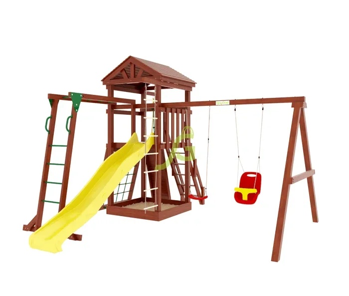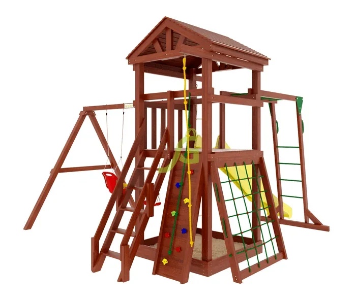 Игровой комплекс изготовлен из дерева и отвечает всем стандартам качества. Вы можете разместить площадку на своём приусадебном участке или даче. Конструкция не займёт много места и гармонично впишется в ландшафт сада. Конструкция площадки учитывает мельчайшие детали, поэтому является не только безопасной, но и очень комфортной для ребёнка. Родители тоже почувствуют удобство при сборке площадки, которая легко скрепляется и устанавливается на участок по приложенной инструкции.