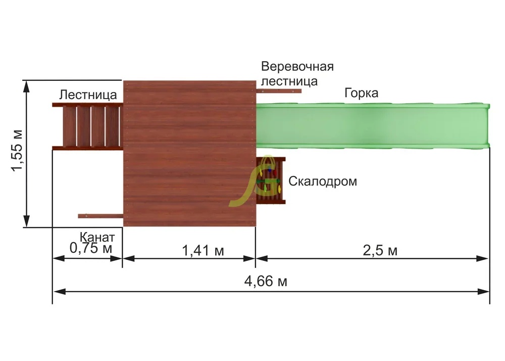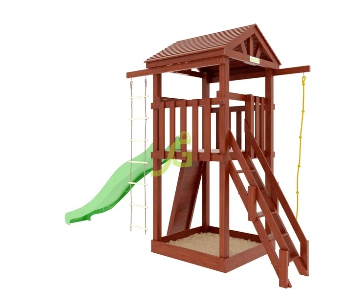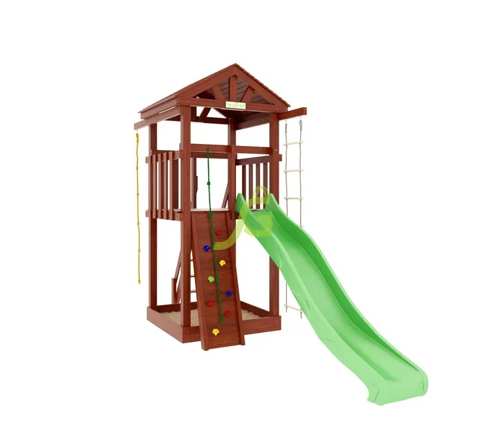 "Панда Фани Tower" - это уникальная площадка для малышей, которые обожают взбираться по лестнице, канатам и скалодрому, попутно придумывая сотни весёлых игр. Игровой комплекс включает в себя полезные элементы, которые точно не останутся без внимания маленького непоседы: - скалодром - ключевой элемент данной модели. На деревянной основе надёжно закреплены пластиковые держатели, имитирующие разноцветные камни. Поднявшись по скалодрому, малыш попадёт на второй уровень площадки; - песочница - расположенная на первом уровне, она надёжно защищена деревянной крышей, так что играя там, ребёнку будут не страшны солнечные лучи и внезапный дождь; - канат - отличный тренажёр для мышц рук и ног. На канате расположены узлы, которые помогают быстрее подняться наверх; - верёвочная лестница - взбираться по ней на башню гораздо веселее, чем по классической, к тому же ребёнок попутно развивает координацию и укрепляет мышцы; - скат для горки - поднявшись на башню, ребёнок может придумать там множество игр, после чего покинуть свой "пост" по волновой горке. Детская площадка для дачи "Панда Фани Tower" скалодром - это отличный подарок для малыша и его родителей, которые смогут расслабиться и выпить чашечку кофе, пока их ребёнок занят разнообразными играми.