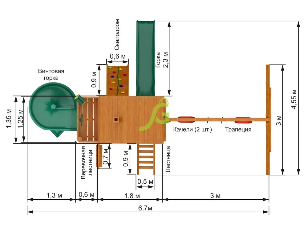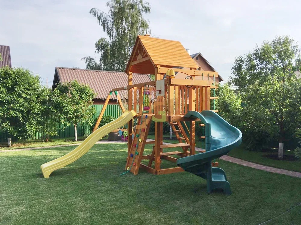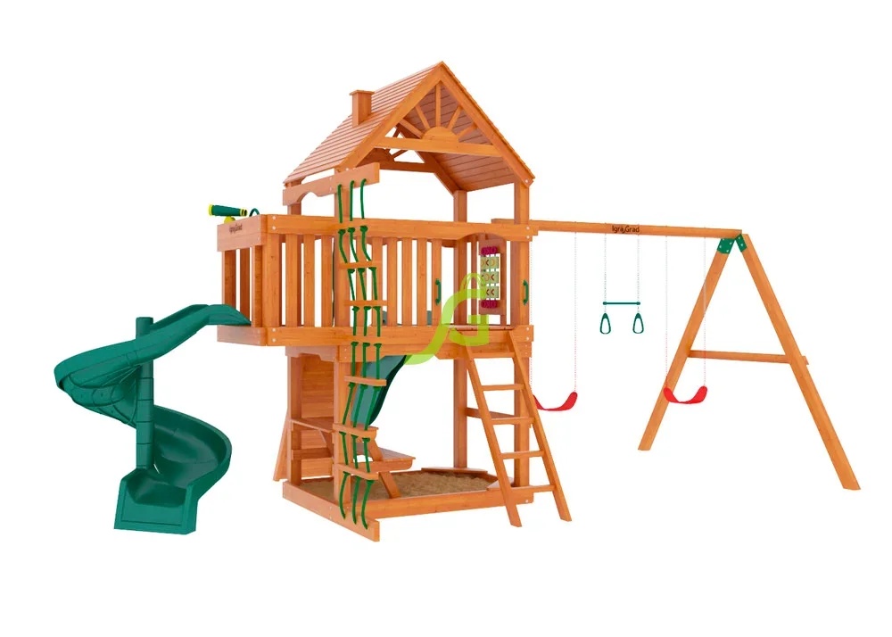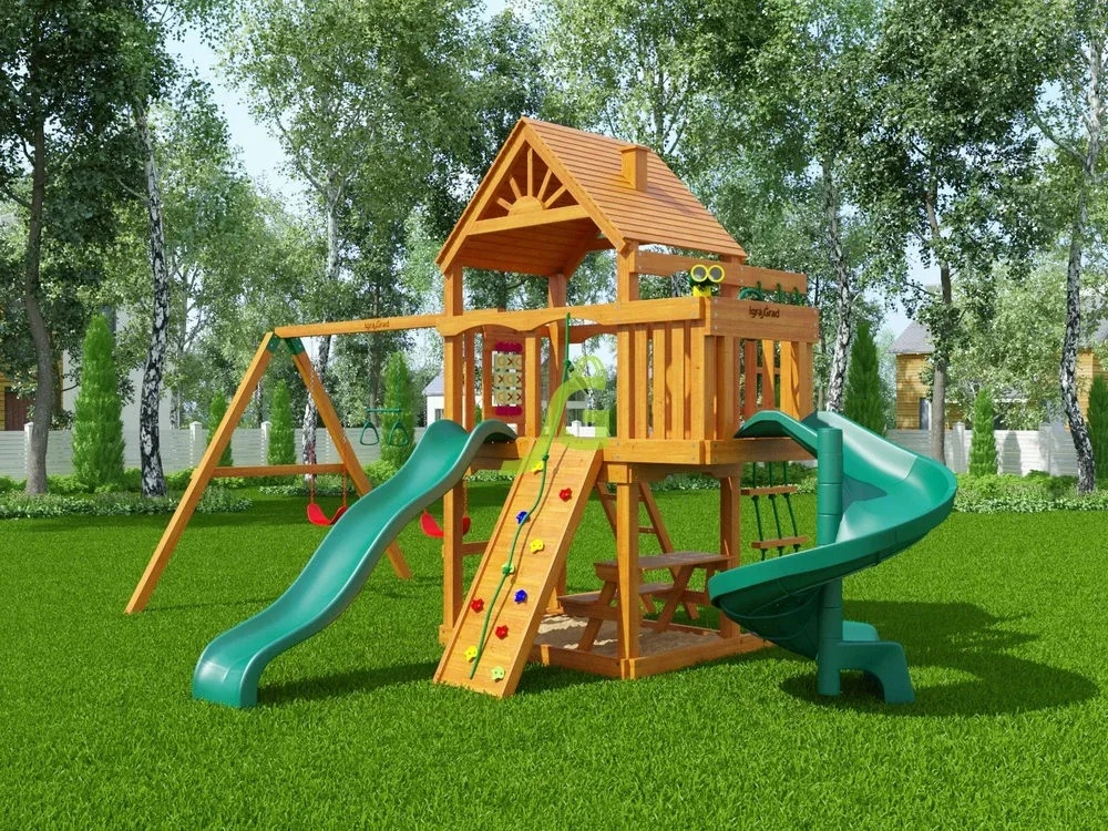 Детская деревянная площадка для дачи «Шато Sun» (Дерево) - целый развлекательный центр. С таким игровым комплексом не соскучишься! Здесь присутствует множество спортивных снарядов, которые благотворно действуют на физическое состояние ребёнка. Через пару недель регулярных игр на такой конструкции Вы заметите, что ребёнок стал сильнее, выносливее, крепче в плане здоровья. Ведь замечательный двухуровневый домик оборудован следующими комплектующими: - волнообразной и спиралевидной горкой; - верёвочной и деревянной лестницей; - искусственным скалодромом с разноцветными камушками; - трапецией с кольцами, качелями. Дети могут поиграть в песочнице, в «Крестики-нолики» на специальной доске. А также понаблюдать за интересным объектом через бинокль или переквалифицироваться в настоящего командира корабля, держась за штурвал и отдавая команды. За удобным столиком можно отдохнуть и перекусить чем-нибудь вкусненьким вместе с друзьями.
