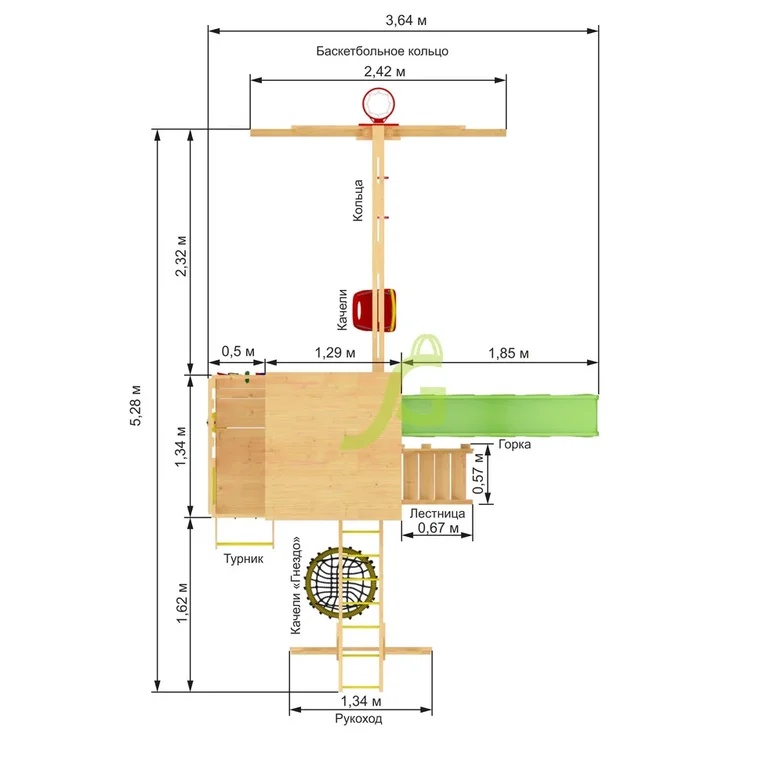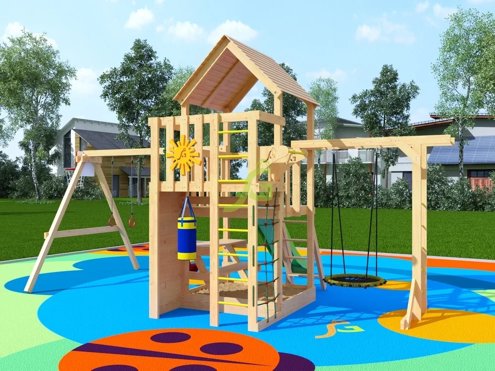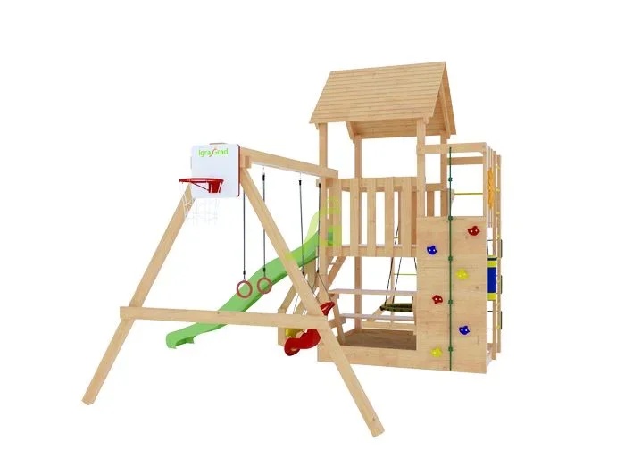 Детский городок для дачи Крафт Pro 2 включает: - конструкция двухуровневой башни из клееного бруса 70х70 мм; - деревянная крыша; - волновая горка Yulvo 2,2 м; - деревянная лестница с перилами; - рукоход; - столик-лавочка; - канат; - качельный модуль; - сетка для восхождения; - боксерская груша с перчатками; - качели "Гнездо" 60 см; - турник; - гимнастические кольца; - декоративный элемент "Солнышко"; - деревянная лестница; - скалодром; - баскетбольное кольцо; - качельный модуль; - пластиковые кубельковые качели (1 шт.); - комплект фурнитуры; - шаблон для присадки (сверление отверстий); - руководство по сборке.