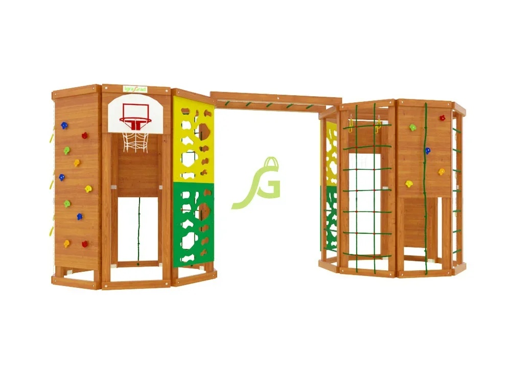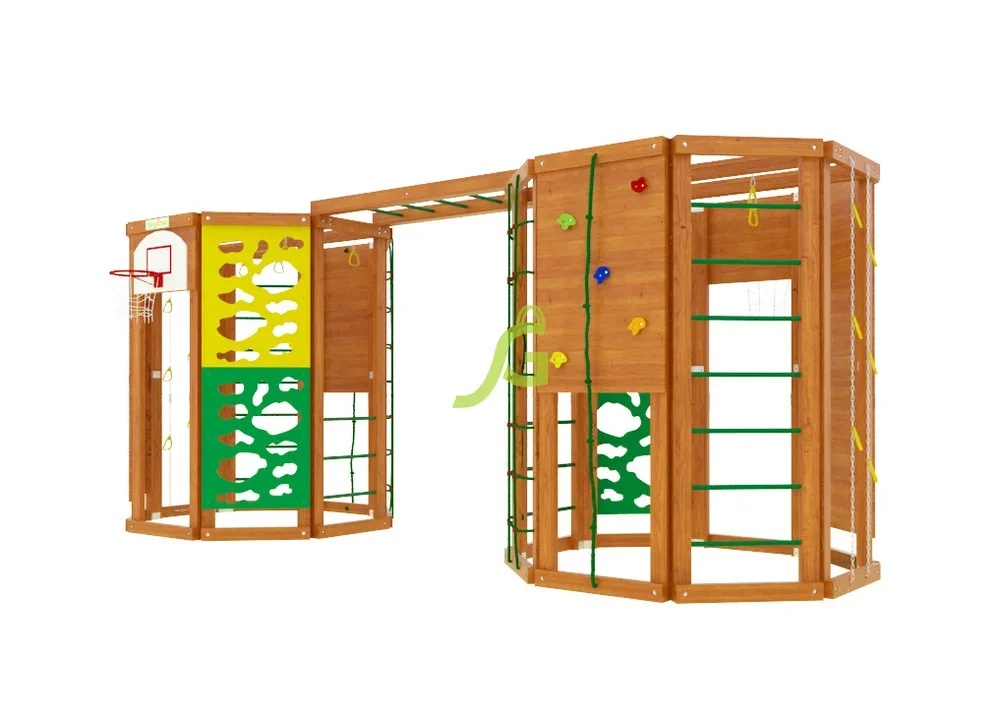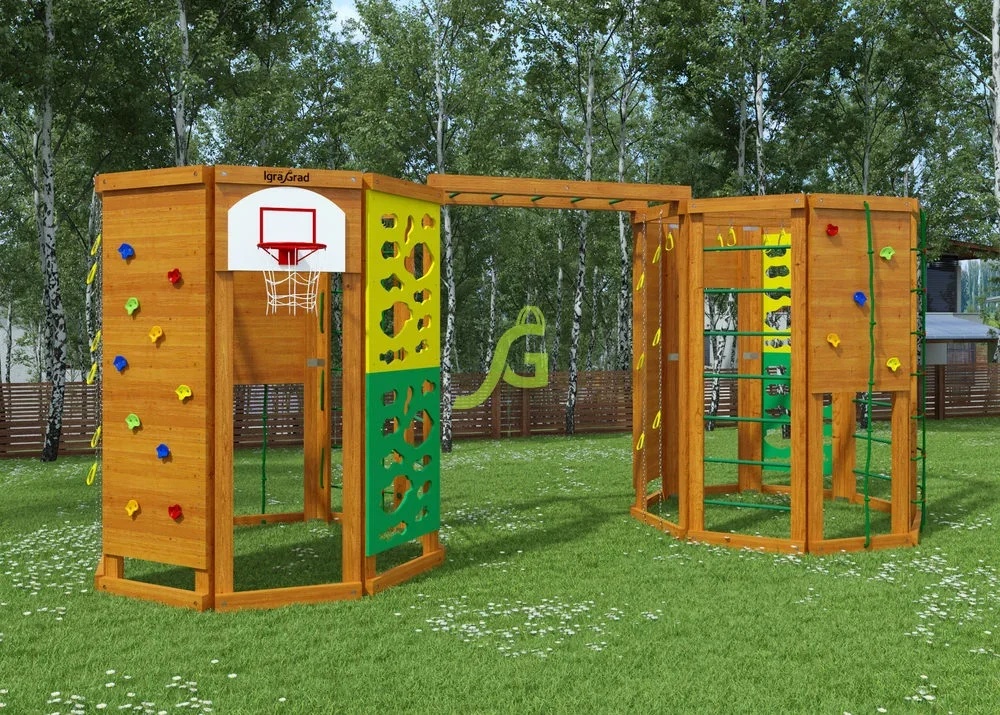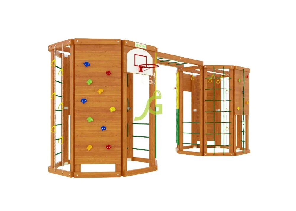 Спортивный комплекс для дачи "WorkOut" включает: баскетбольное кольцо со щитом; "обезьянья тропа"; скалодром; элемент шведской стенки; веревочная лестница; стена.