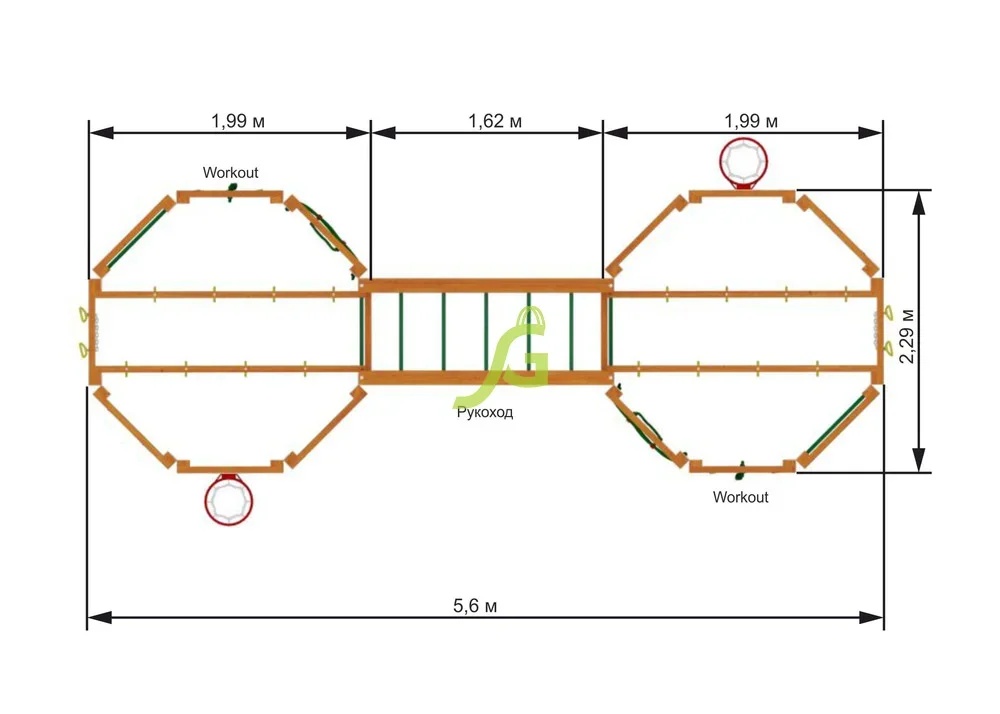 Спортивный комплекс для дачи "WorkOut с рукоходом" включает: рукоход; баскетбольное кольцо со щитом; "обезьянья тропа"; скалодром; элемент шведской стенки; веревочная.
