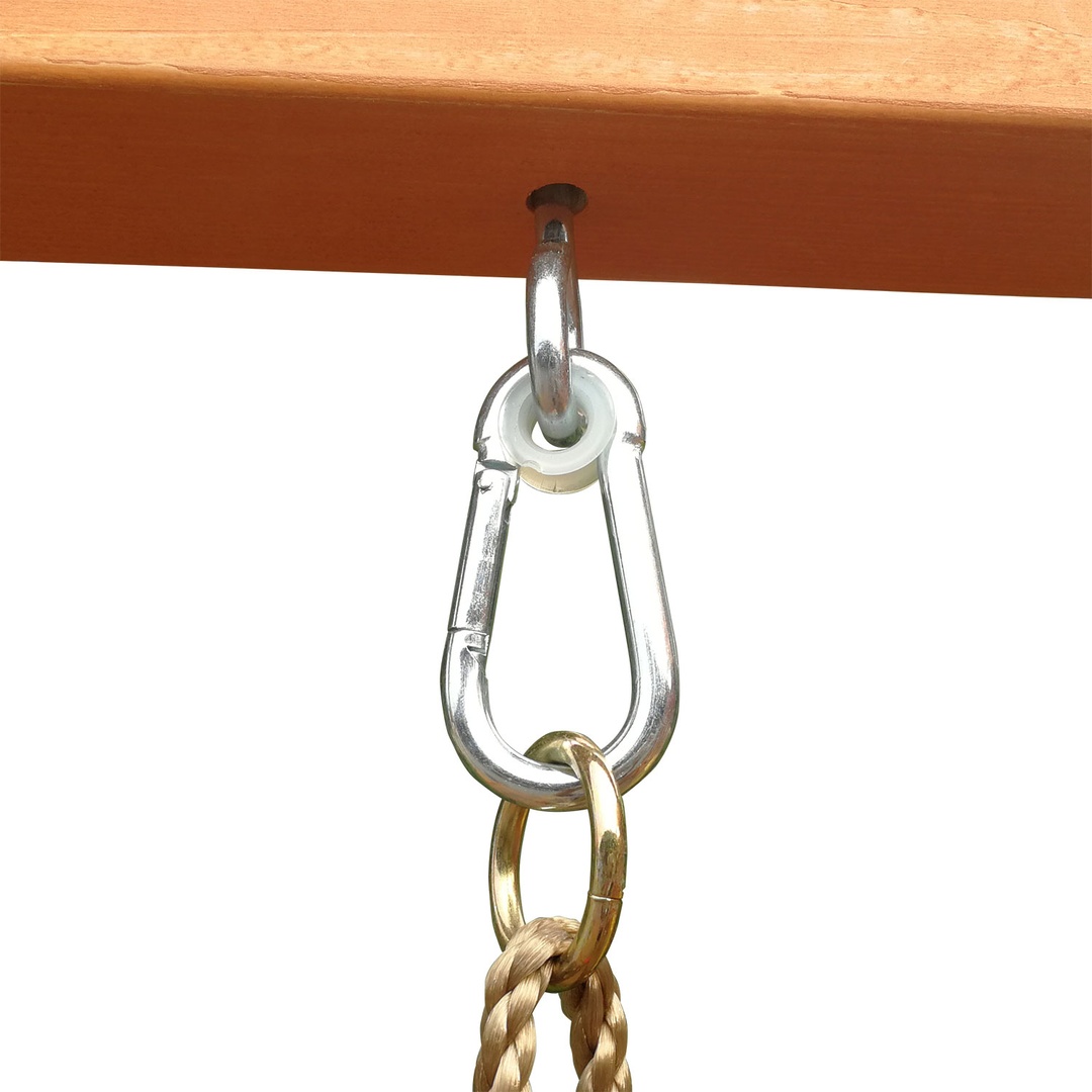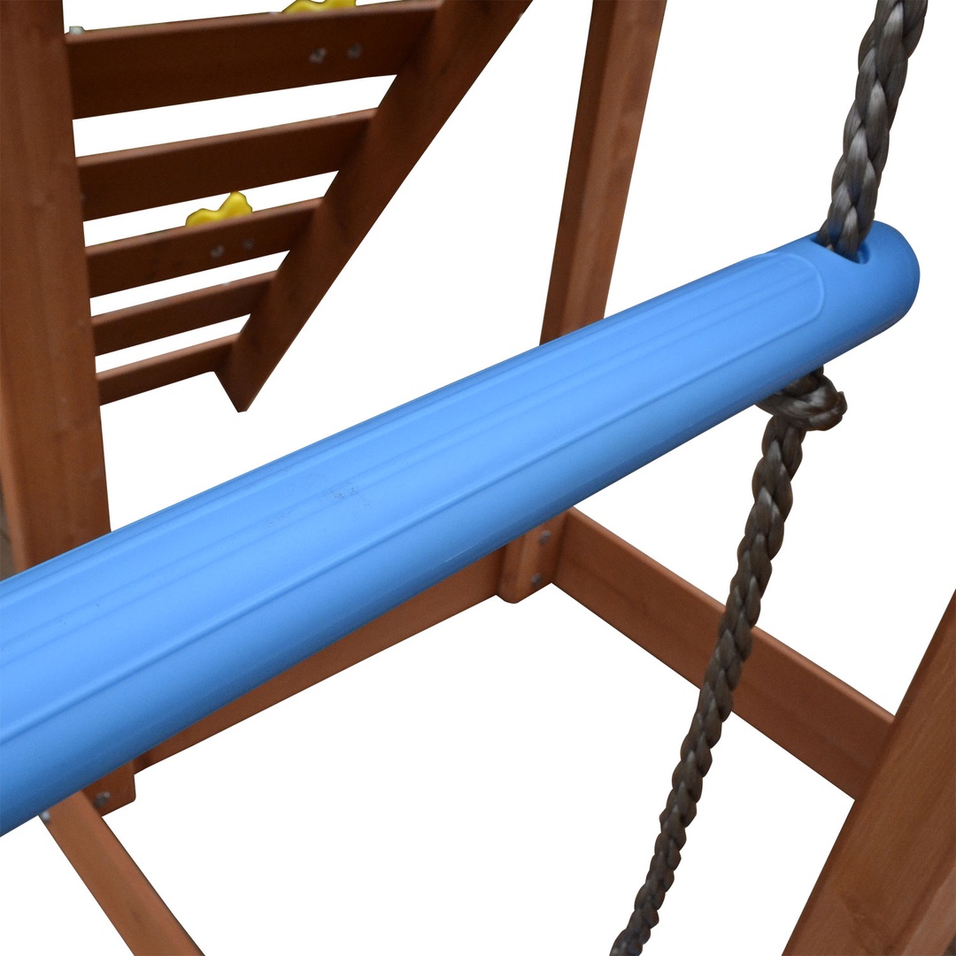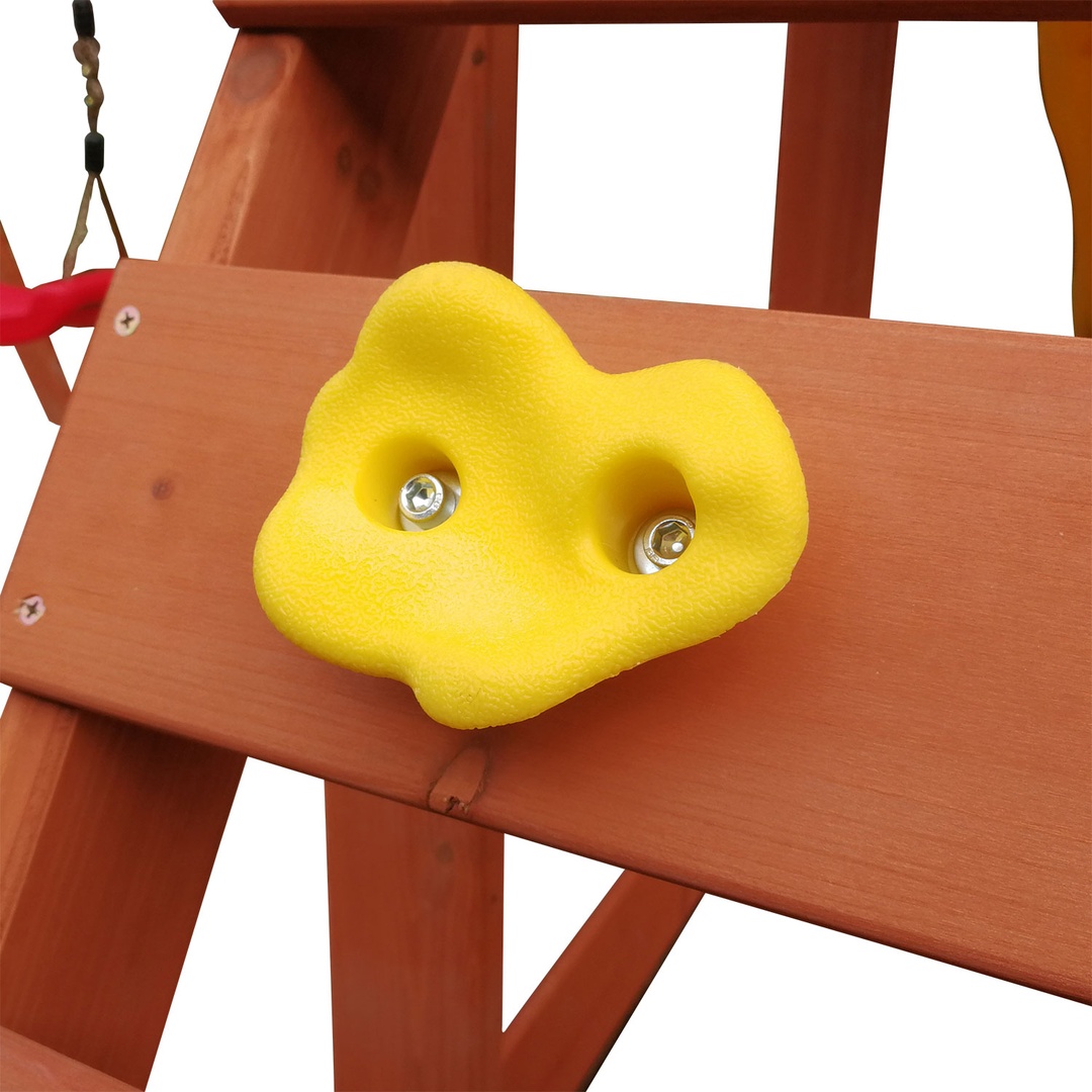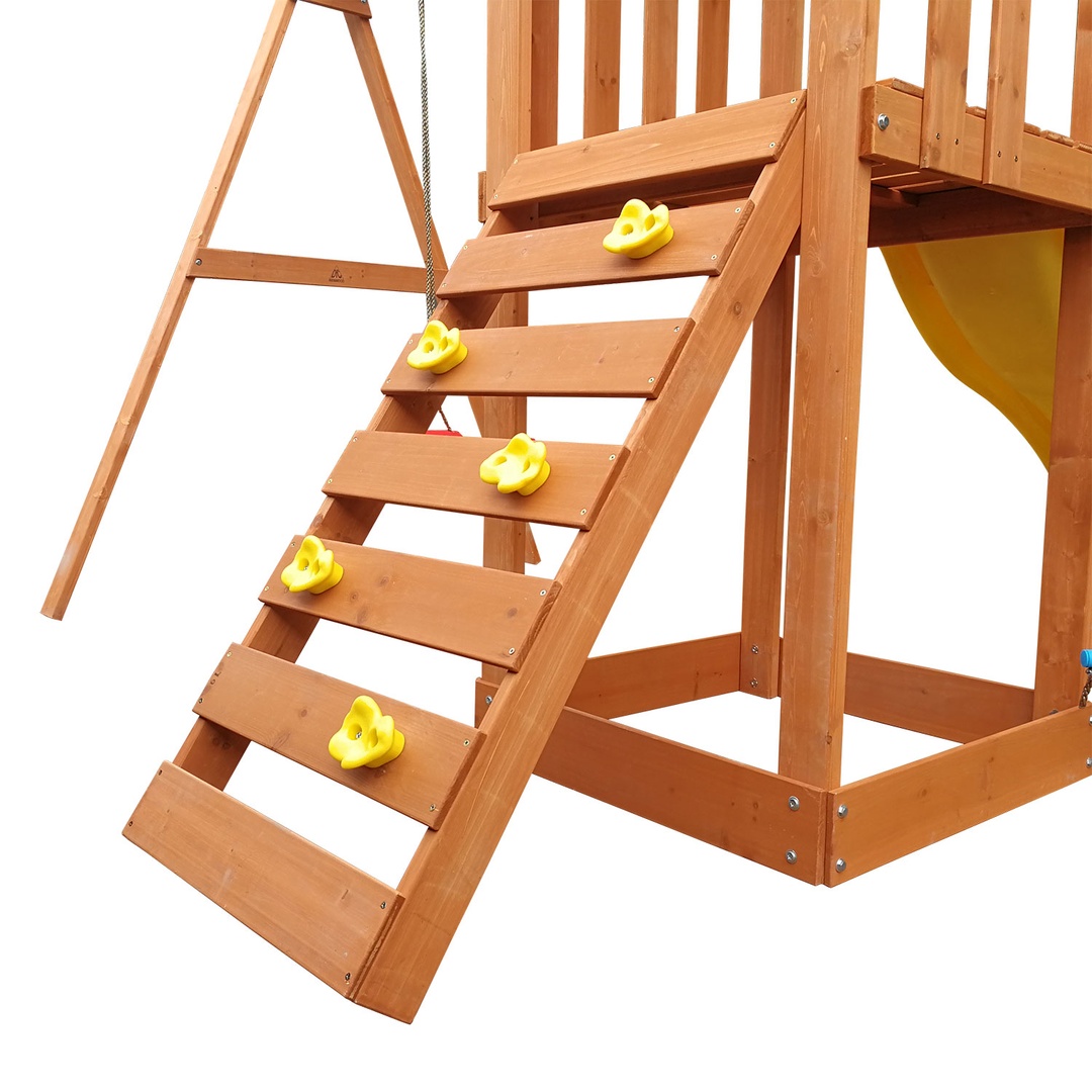 Горка с двойной волной снабжена боковыми бортиками, обеспечивающими безопасность малышей. Дополнительными элементами для развлечений служат одиночные качели и веревочная лесенка. Качели на боковой части комплекса имеют надежное подвесное крепление. Скалодром с 5-ю камнями - зацепами поможет развить ловкость.