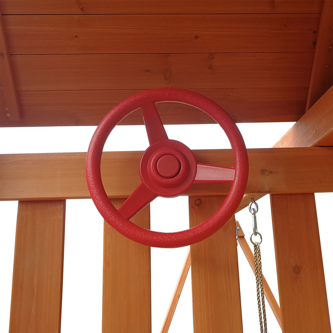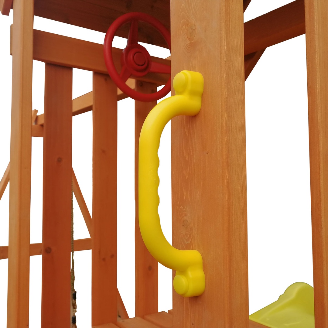 | В комплект городка входит | деревянный игровой домик с крышей (башня), горка волнистая, веревочная лестница, качели одиночные 1 шт., песочница, штурвал (внутри домика), скалодром (5 камней - зацепов) |