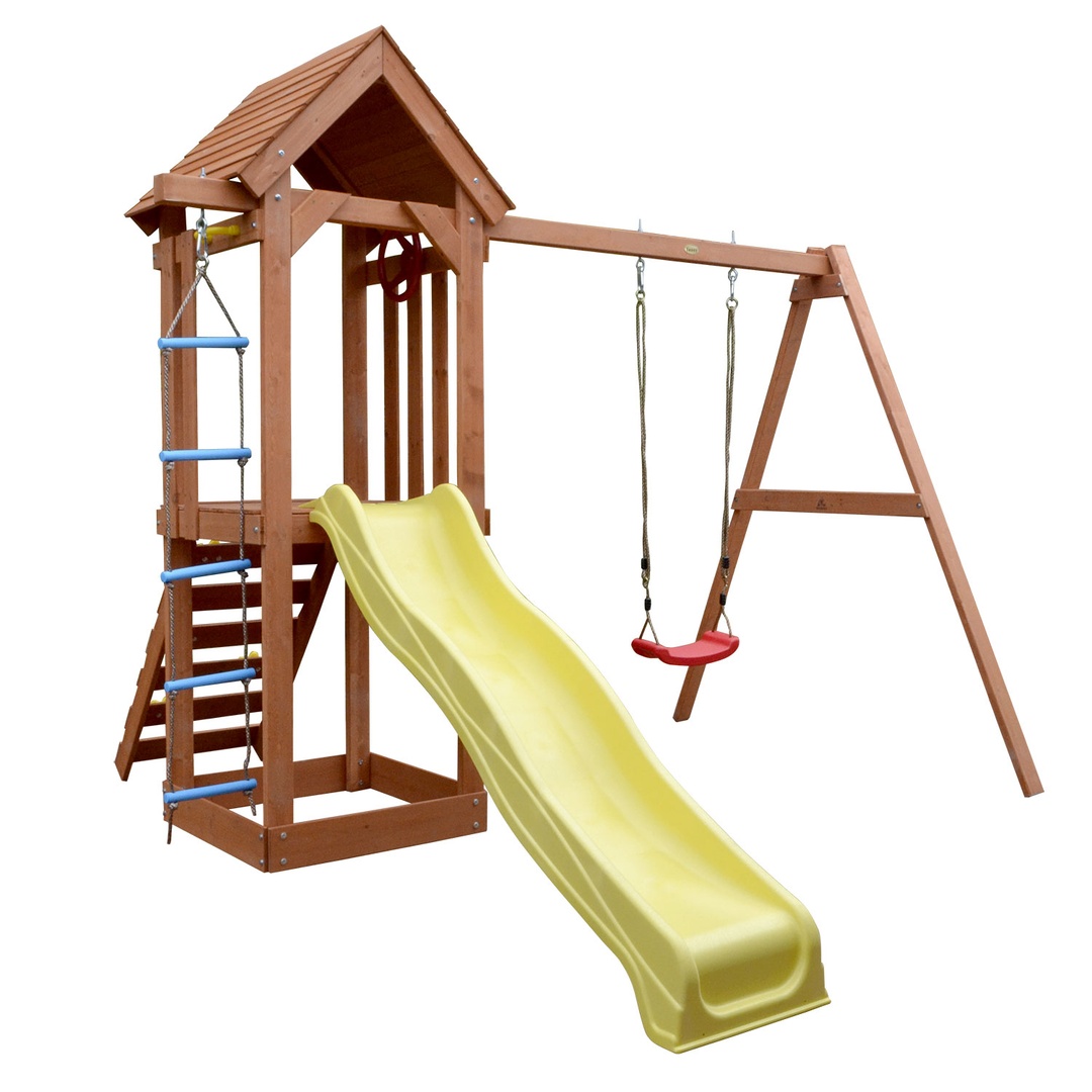 Центральная часть комплекса представлена небольшим домиком - башней под деревянной крышей. Нижний ярус можно использовать под небольшую песочницу.