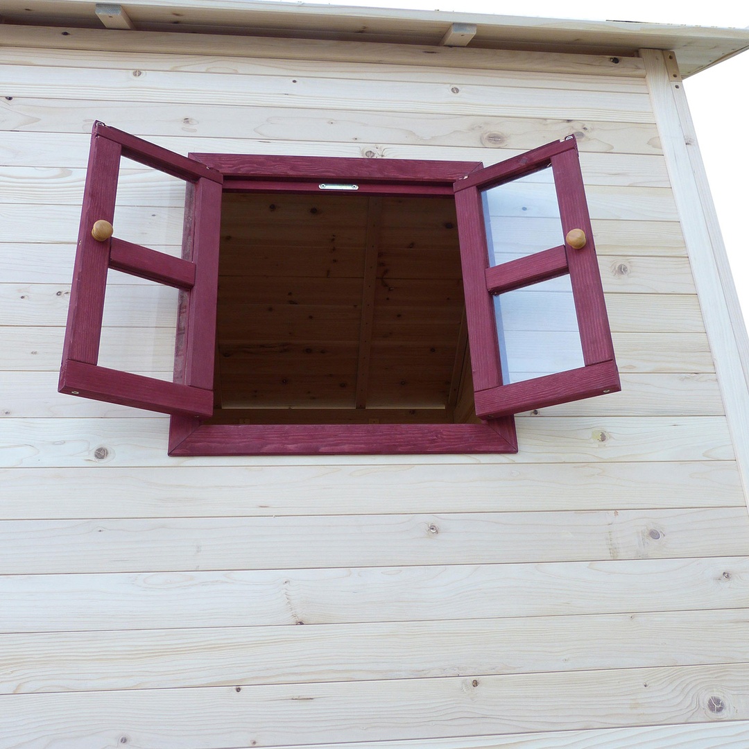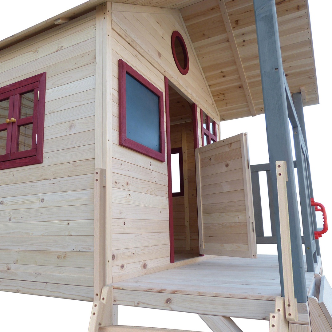 Центральная часть комплекса представлена игровым домиком под надежно укрепленной крышей. Для самых маленьких внизу предусмотрена песочница.