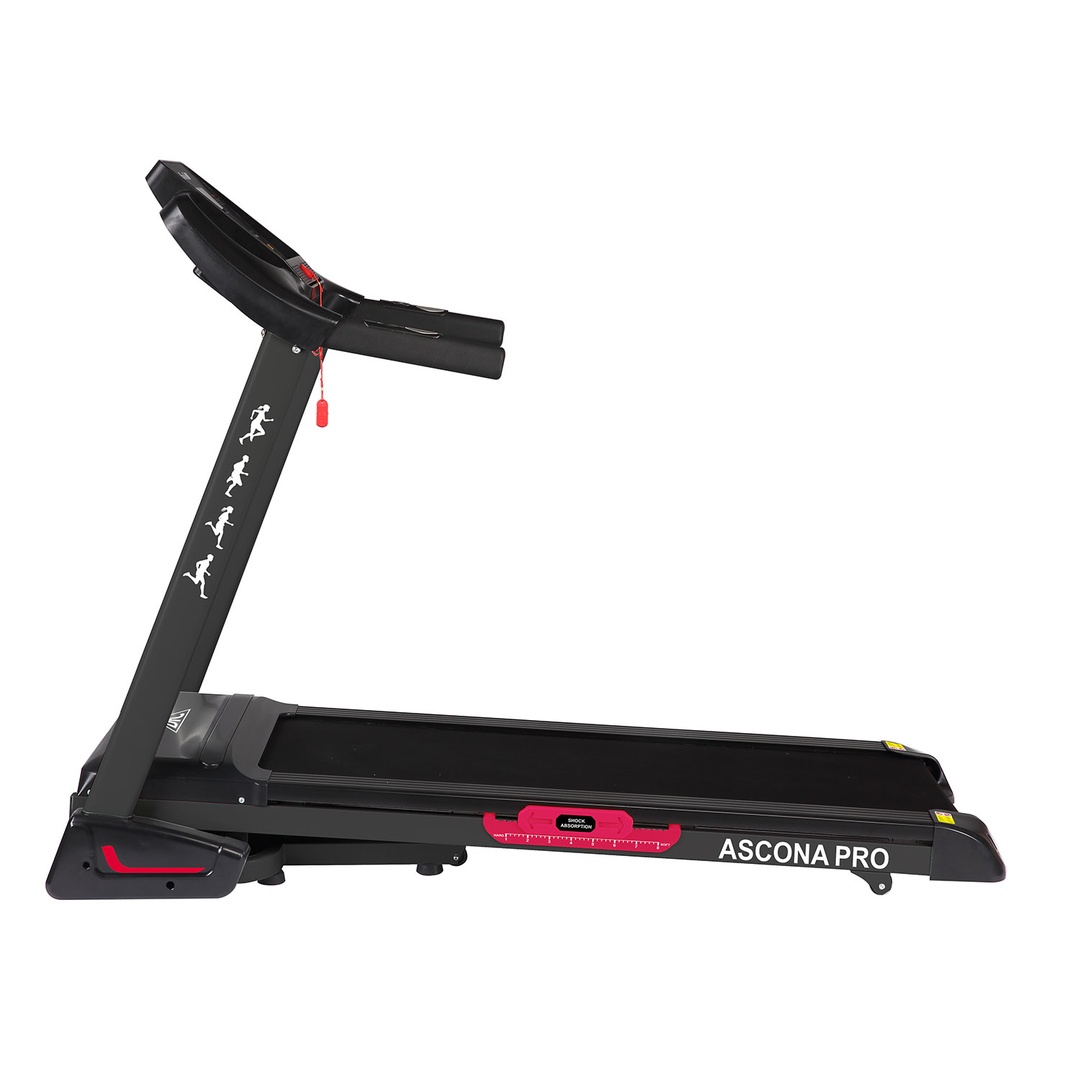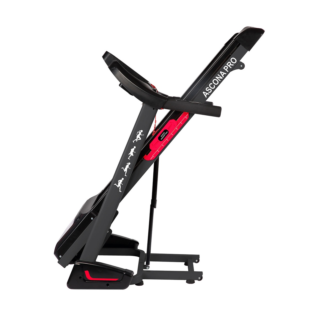 Представляем новую беговую дорожку от популярного бренда DFC - модель ASCONA Pro. Дорожка предназначена для домашнего применения. В арсенале модели встроенный двигатель постоянного тока мощностью 2,5 л.с. При пиковых нагрузках мощность увеличивается до впечатляющих 3,25 л.с. Угол наклона бегового полотна изменяется c помощью дополнительного встроенного электромотора. Встроенные динамики звуковой системы и возможность подключения дополнительных устройств через MP3-разъем помогут провести тренировку под любимую мелодию. Амортизация с регулировкой жесткости поможет сохранить суставы про время продолжительной тренировки. Два комплекта встроенных в поручни датчиков пульса позволят следить за частотой сердечных сокращений. Такие датчики имеют определенную погрешность. Для точности показаний рекомендуем приобрести нагрудный пояс с монитором в форме часов DFC W117. На поручнях так же расположены "быстрые кнопки" - это кнопки запуска и остановки бегового полотна, а так же кнопки изменения скорости. Это позволяет не отрывать руки с поручней во время занятий не тренажере. Дорожка имеет складную конструкцию для экономии жизненного пространства с помощью гидроцилиндра. И встроенные колеса для перемещения дорожки после тренировки.
