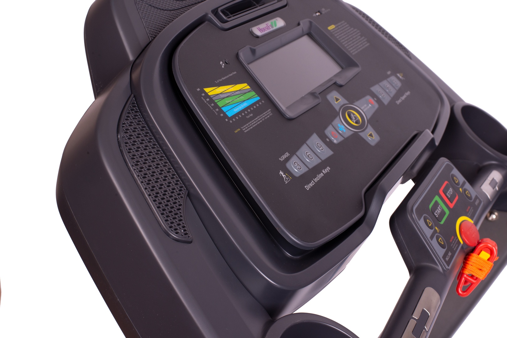 Тренировочный компьютер оснащен цветным дисплеем диагональю 6.8 дюймов для отображения самых важных показателей тренировки: скорость, время, расстояние, калории и угол наклона бегового полотна (0-15%), а также программных профилей. В число самих программ входят 12 режимов, направленных на решение самого широкого спектра задач – от развития силы и выносливости до снижения веса и улучшения сердечно-сосудистой системы. Помимо предустановленных программ, можно воспользоваться самостоятельно регулируемым ручным режимом, а также создать собственную программу тренировки. В дорожке установлена система анализа телесного жира «Body Fat», она позволит измерить максимально точный процент доли жира в организме.