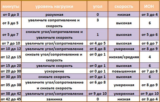 Устанавливается режим скорости и угол наклона, которые рассчитываются для каждого индивидуально исходя из весовых, ростовых, возрастных данных. Отслеживается реакция организма.- Добавляются занятия на других снарядах, другие нагрузки.