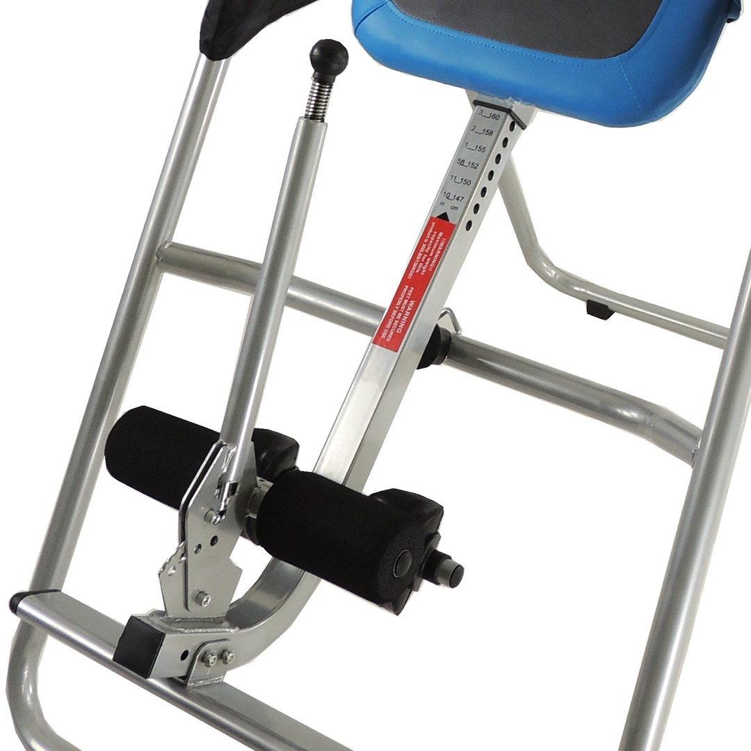 Рост пользователя от 140 до 196 см. Вес пользователя до 110 кг. Новая модель складного инверсионного стола с ограничением угла наклона с помощью ремешка.