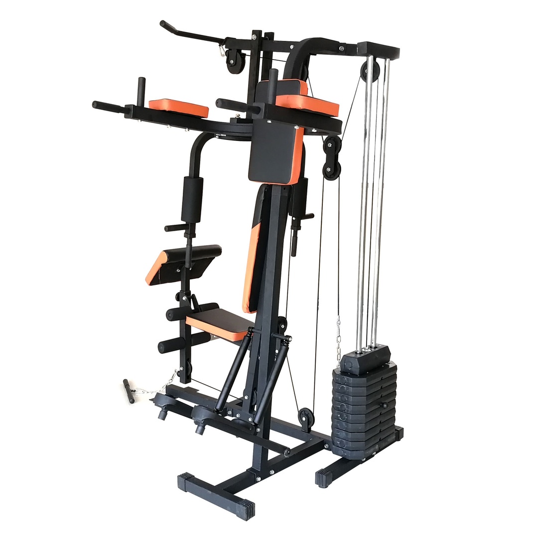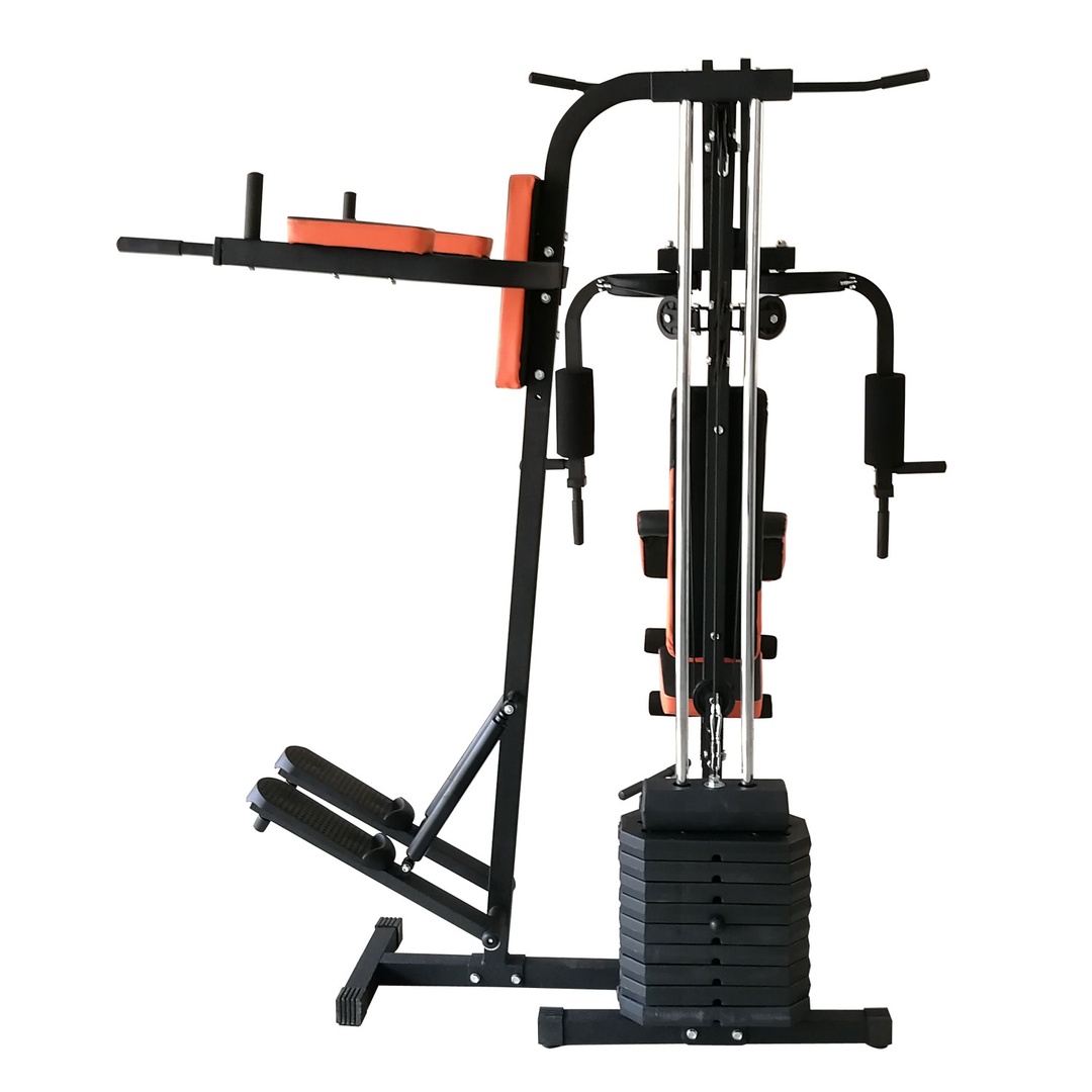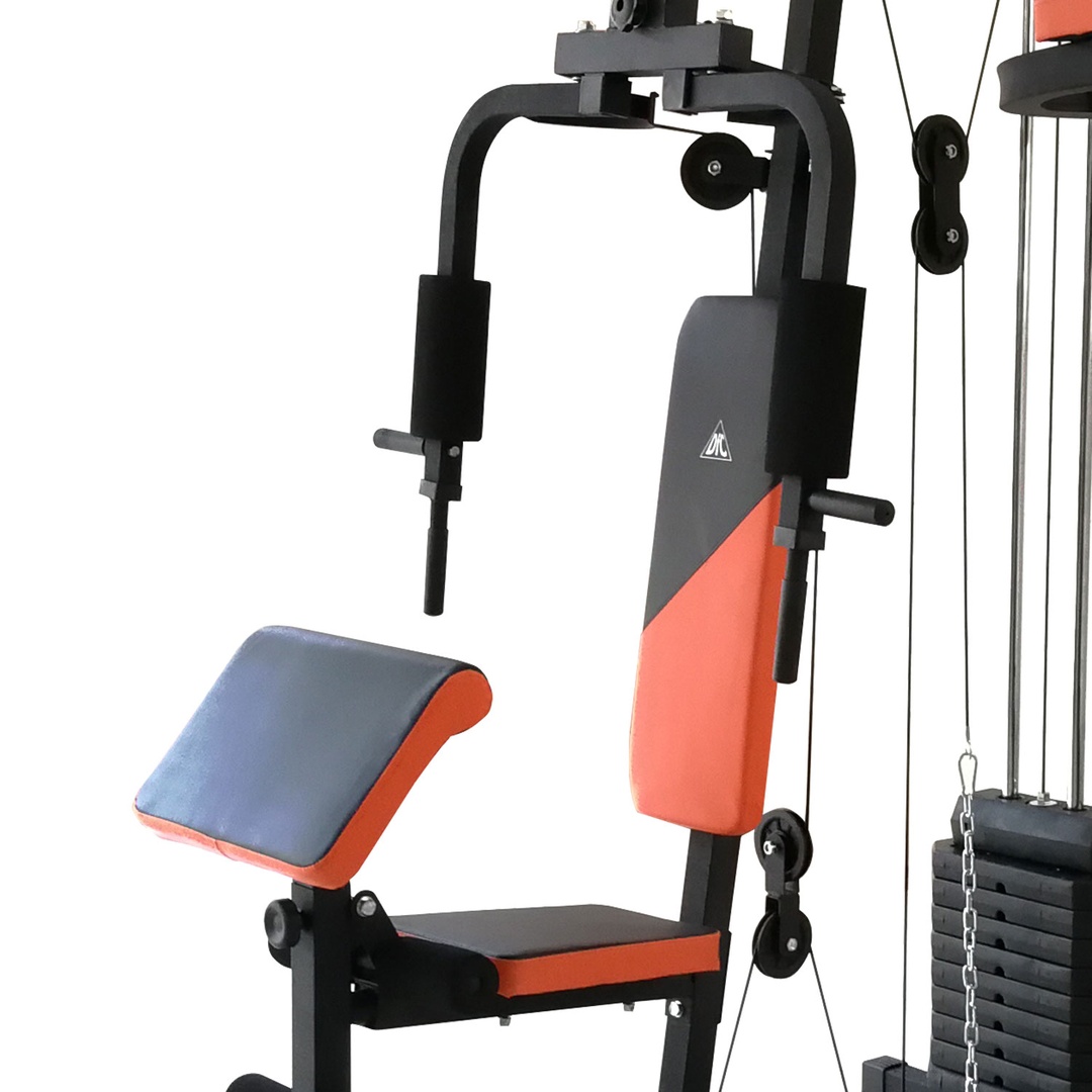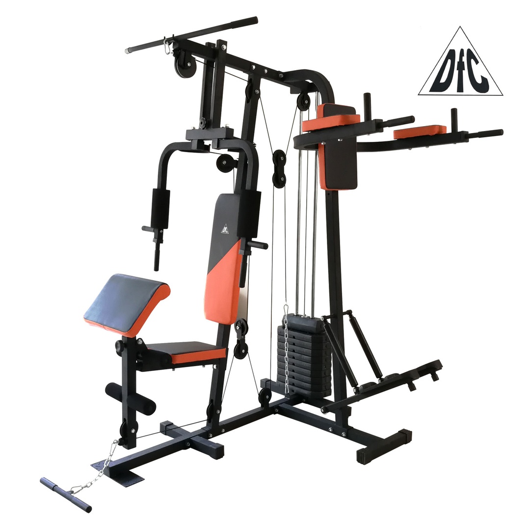 Многофункциональный тренажер с встроенным весовым стеком. Позволяет выполнять комплекс упражнений на различные группы мышц. Дополнительно тренажер имеет брусья для отжимания и степпер с гидроцилиндрами.
