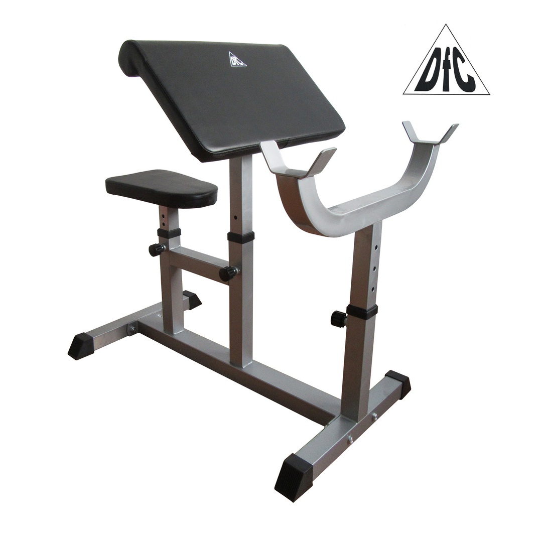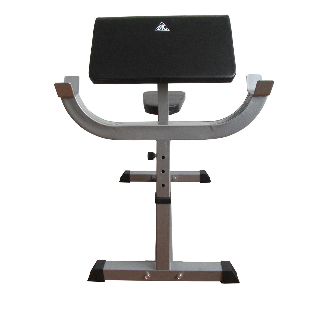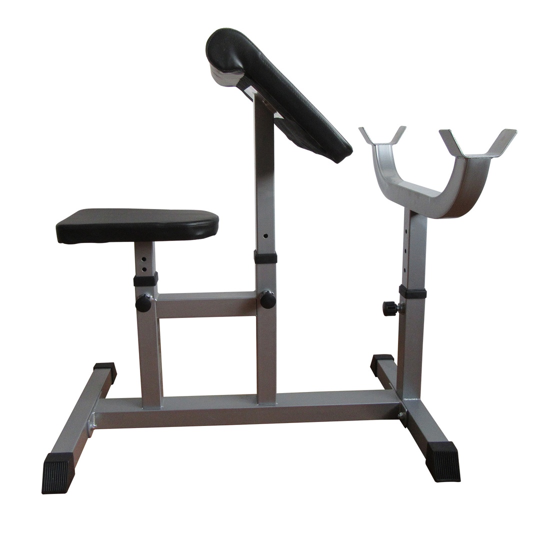Сиденье, парта для бицепса и стойки под штангу регулируются по высоте.