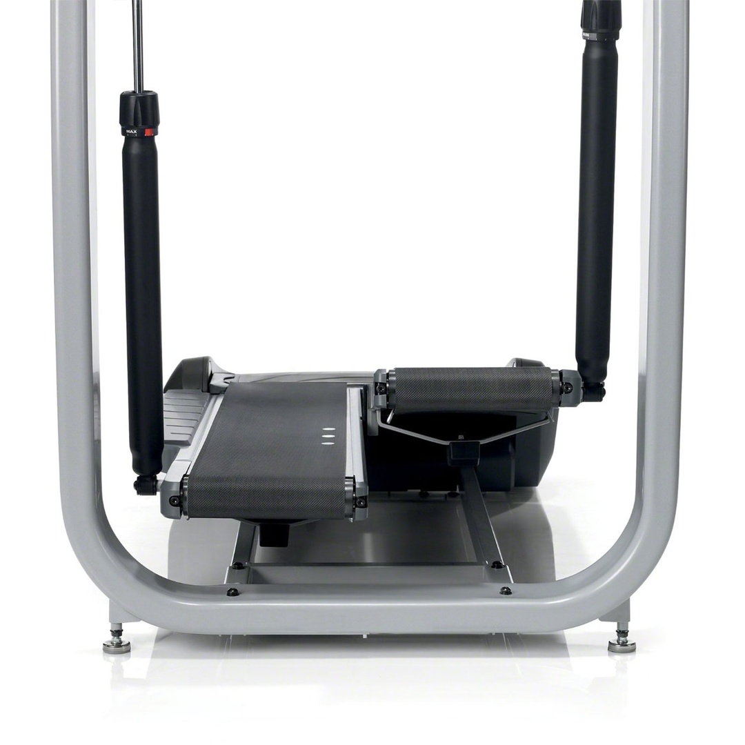 Универсальный дизайн с множеством инновационных решений. Так, массивный тренажёр занимает в помещении не так много место. Транспортные колёса в задней части помогут в перемещении тренажёра при необходимости.