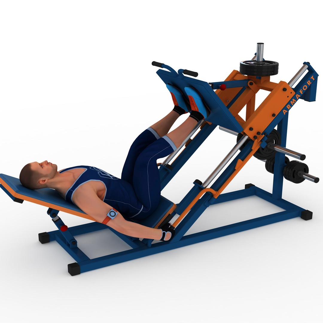 Тренажёр жим ногами под углом в 45 градусов предназначен для тренировки квадрицепсов, бицепсов бедра и ягодичных мышц, без включения поясничного отдела позвоночника. Мышцы пресса участвуют в тренировке, как вспомогательные.