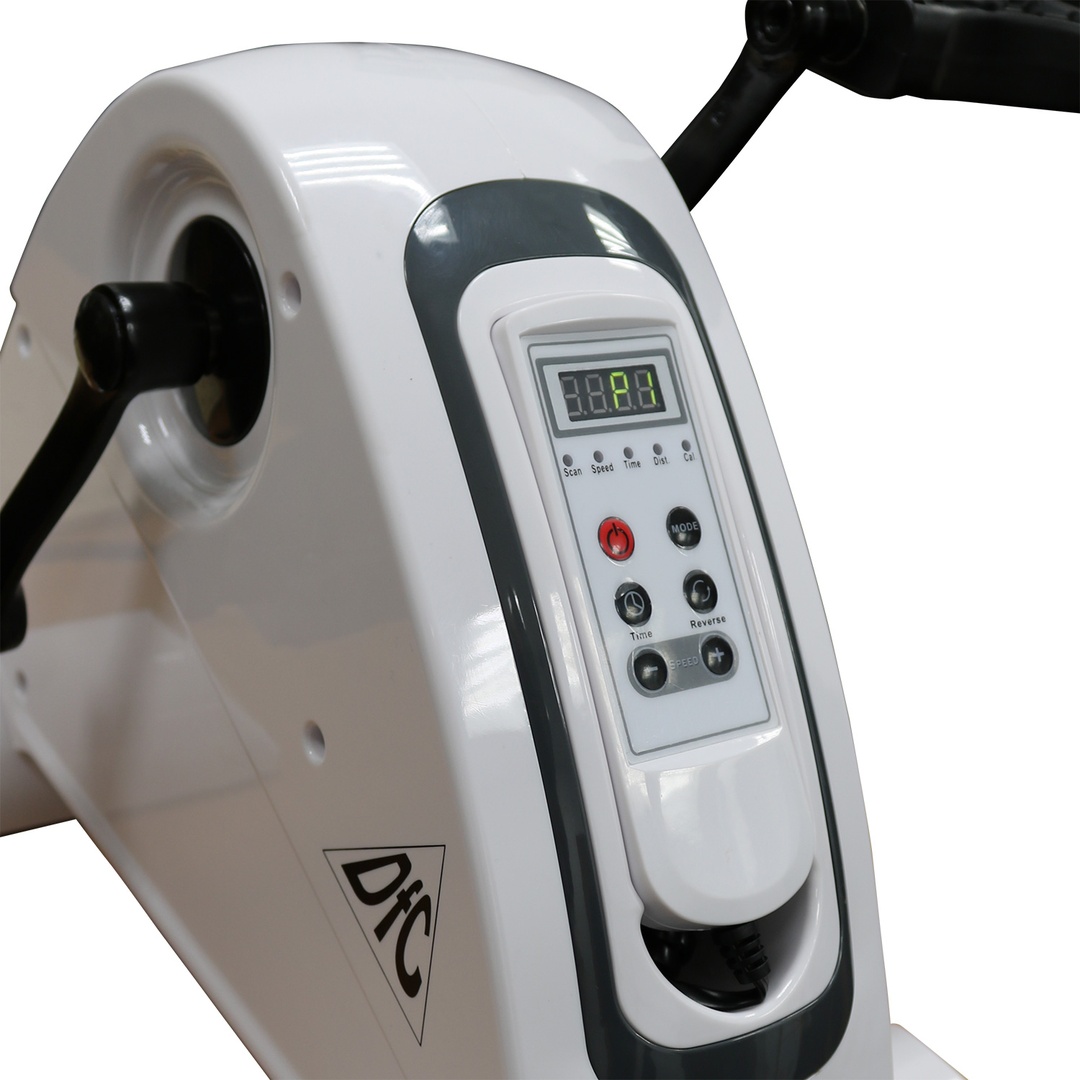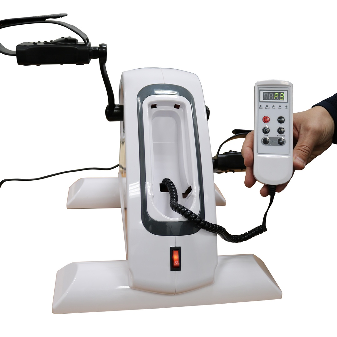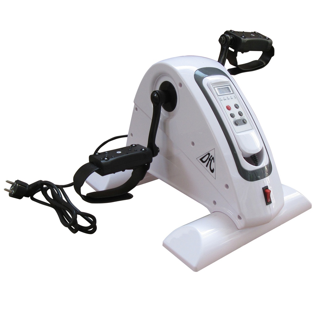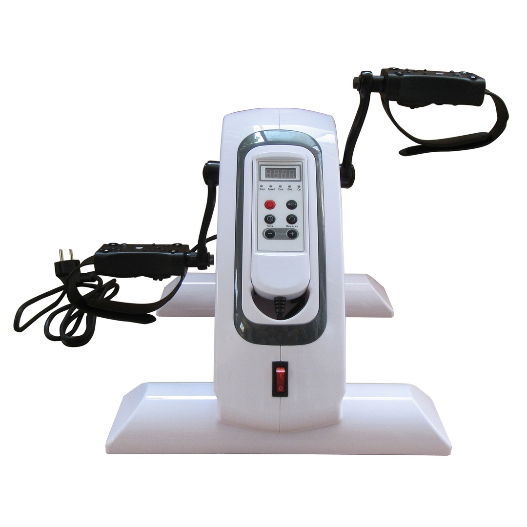 • Широкие педали с регулируемыми ремешками крутятся за счет электродвигателя и заставляют двигаться руки и ноги с разной нагрузкой