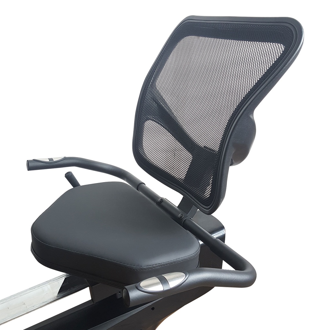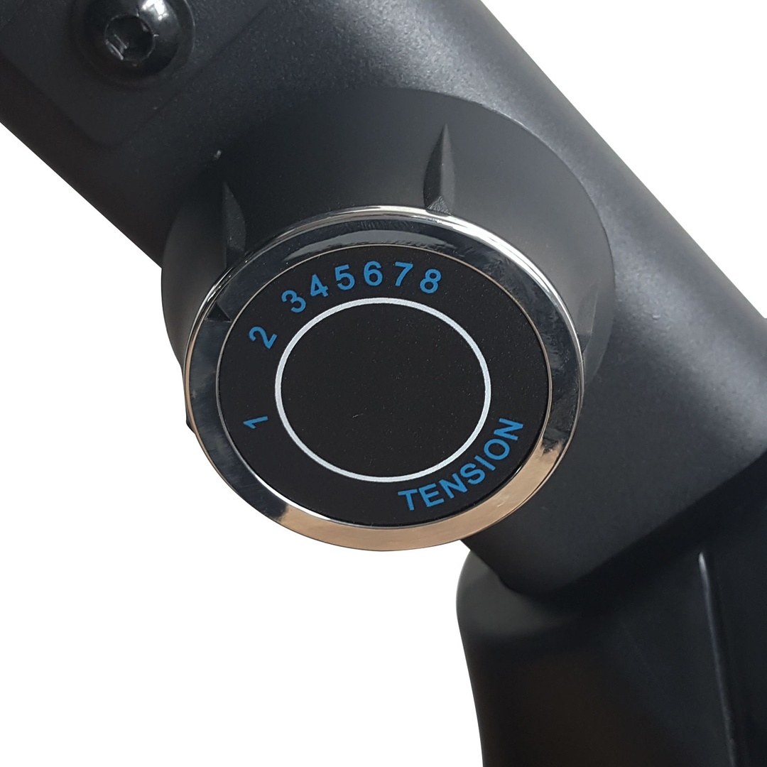 Нагрузка имеет ручную регулировку с помощью ручки на стойке тренажера, 8 положений. Мягкое регулируемое сиденье с мягкой спинкой.